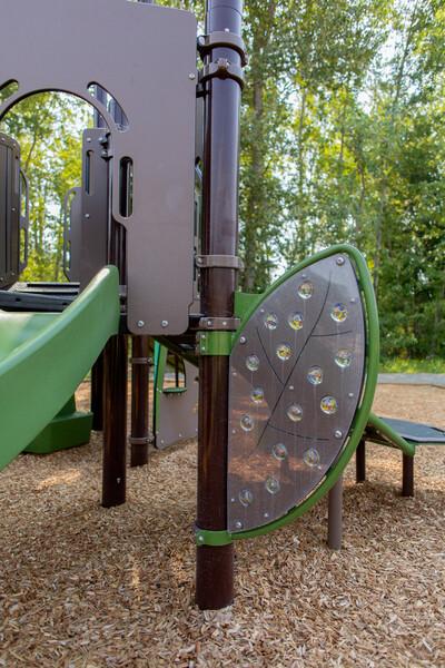 With a color palette as fresh as spring, this whimsical playstructure looks like it’s sprouting from the earth. A foliage-themed Marble Panel® engages the senses at ground level. Above, a leaf slider delights as little ones navigate the bridge beneath a canopy of SkyWays® shade fabric. Tots can step or crawl across leafy pods, slide flower blossoms back and forth, or whoosh down one of two slides to ring the chimes at the bottom. Pair Sprig with the matching  Tree Tops® playstructure for kids ages 5 to 12, and you’ll create an entire forest of play.