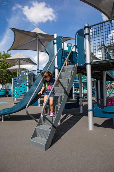 [video: scene fades in to the camera following the legs and feet of a young girl as she steps down a PlayBooster Step Ladder. She takes her time walking down step by step. Scene switches to a full view of the Step Ladder as they young girl quickly walks up to the playground decking. Camera switches to a side view of the Step Ladder as the young girl holds onto the side railings while walking back down the Step Ladder. A boy in the background shouts as she reaches the bottom of the ladder.]