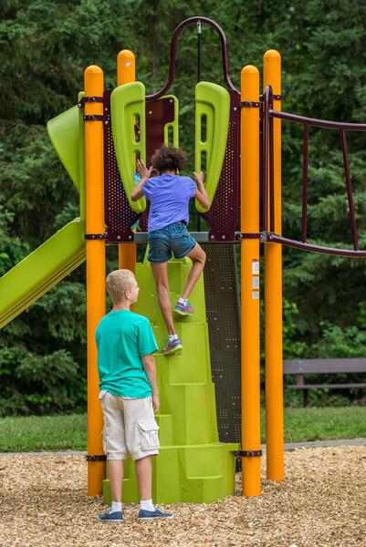 - Uniquely designed laser-cut perforated steel and polyethylene handholds help kids transition from climber to deck