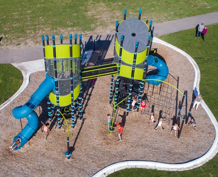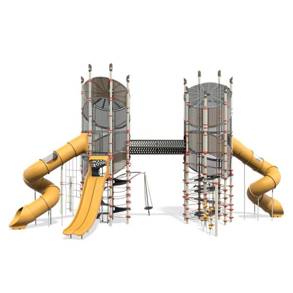 Netplex® to the max! Not only does this structure take the Netplex concept to new heights, but it also doubles the fun with two towers. The center spiral belting with grippy texture provides an easy way for kids of all abilities to climb to the top for a whooshy ride down three slides. Clear sightlines enable kids to enjoy the view from the top while caregivers monitor the activity from the ground. The most popular Netplex components are included and sure to make Super Netplex a favorite play space.