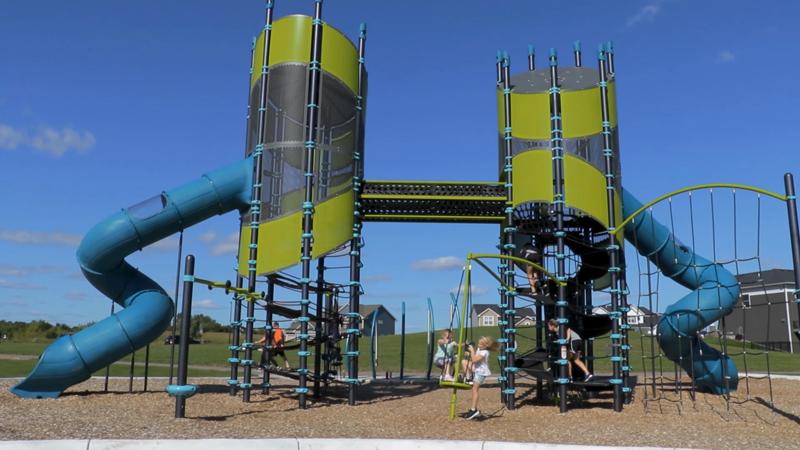 [video: the camera focuses on a girl’s feet as she walks up the spiral belt path of one of the towers. The camera pulls back with a view up the tower as children climb all over the ropes and belt paths. Scene switches to a full side view of the Double Swoosh Slide. Two girls ride down the slide with their hands raised in the air. Camera switches to a inside view of the tower at the top of the TurboTwister Tunnel Slide. A girl waits at the top of the slide for her turn. Scene switches to a ground view up to a child as they crawl through the elevated crawl tunnel between towers.]