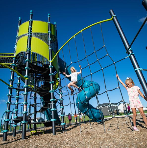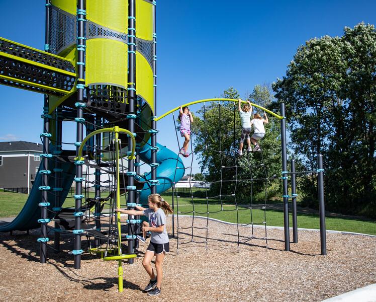 [video: three girls climb up the cargo net of a Portal Climber. Scene switches to a view of the bottom of a Double Swoosh Slide. Two girls ride side by side on the double lane slide. The camera focuses on a child’s feet standing on a spherical foot hold on the SwiggleKnots Bridge. The camera pulls back for a full view of the SwiggleKnots Bridge as three children play on the shifting ropes of the activity. The scene switches to a full view of the Super Netplex as children to play all over.]