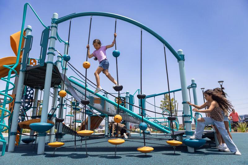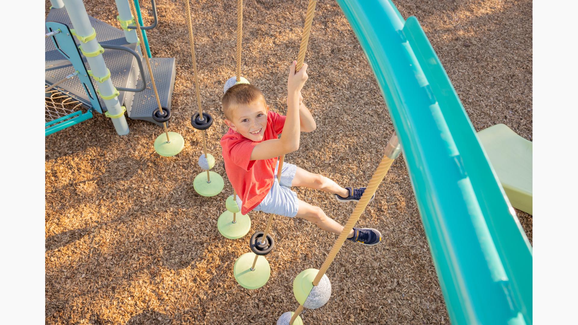 The SwiggleKnots™ Bridge Inclined has discs, pucks, and ball knots for multiple climbing experiences on every cable. The gradual increase in height adds an extra challenge for daring climbers. Kids will have fun creating their own path up, down, and across.