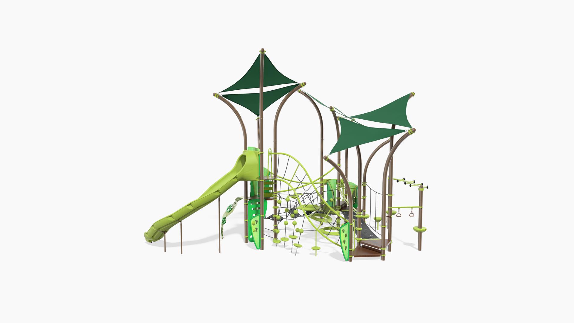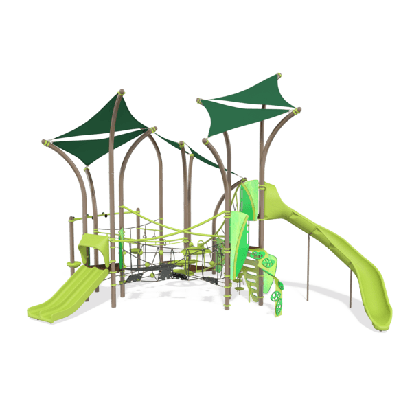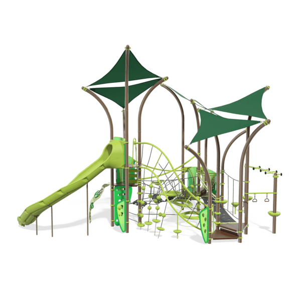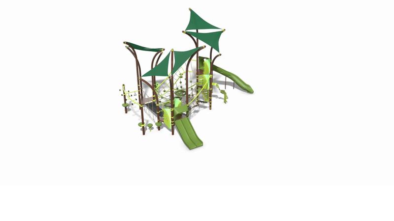 Such a great range of interconnected play activities at multiple levels will spark hours of energetic and imaginative play, all protected by plenty of integrated shade. Whether it’s a tree fort, a forest or an agility race in nature, it will offer great adventure for kids ages 5 to 12.