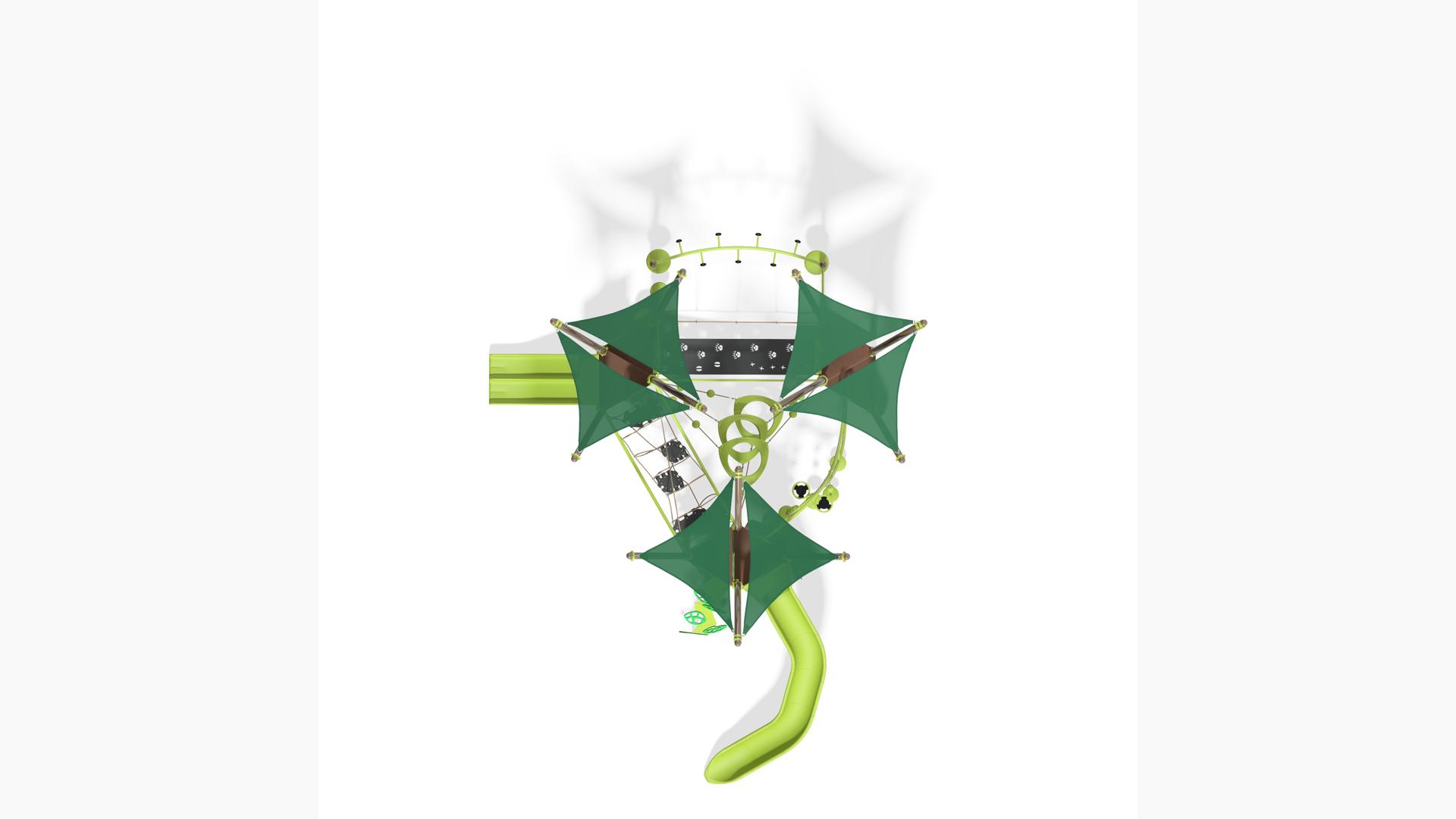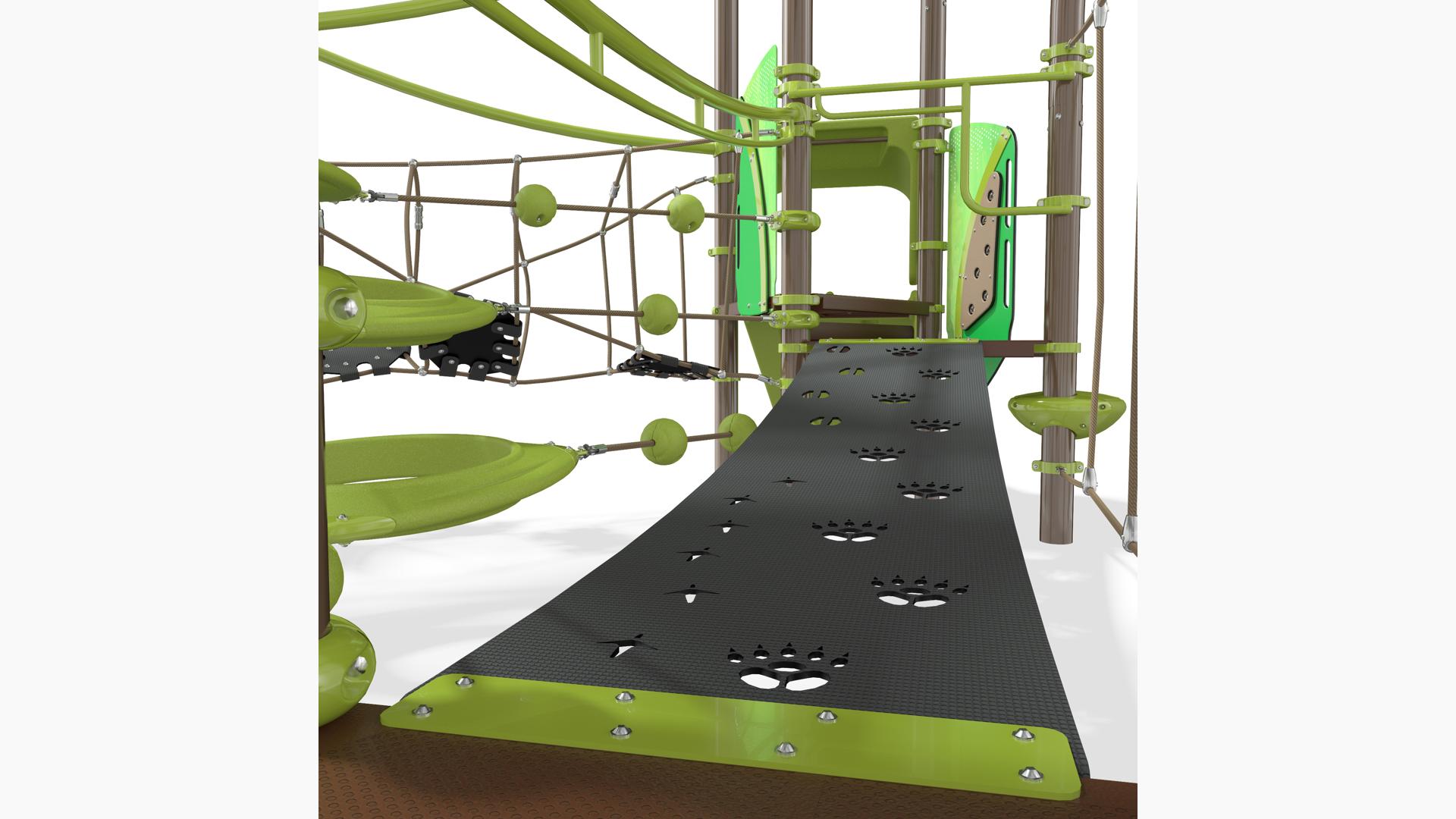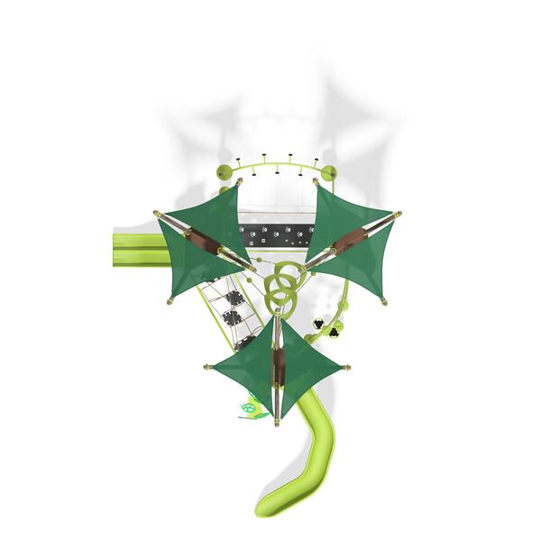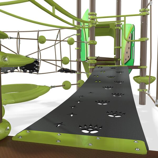 This wondrously abstract playstructure that meets European Standards gives kids the sense of playing in the treetops, exploring a forest branch by branch. But beyond the normal ups and downs of traditional tree-climbing, here kids can also navigate their way crawling through the O-Zone® 3-ring climber, balancing across wiggly bridges, zipping down two different slides, and so much more.