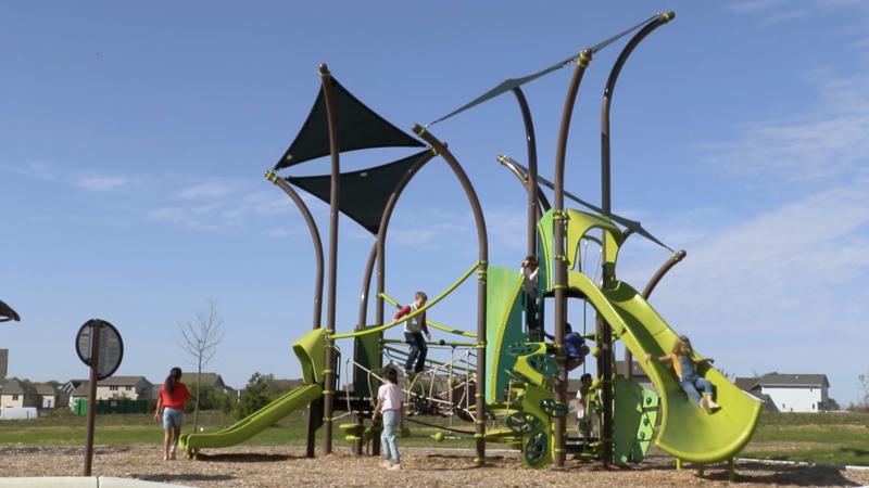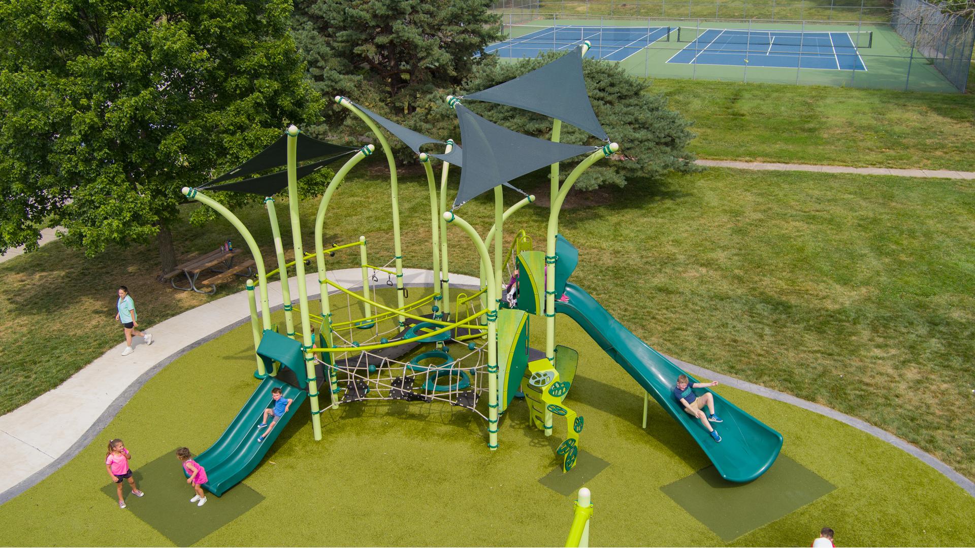[video: the landscape structures logo shrinks and shifts to the bottom right corner of the screen while the text in the left corner appears simultaneously reading: Tree Tops. An animated full elevated view of the back of a school equipped with soccer fields and a playground comes into focus. The view slowly pans closer and closer to the playground area with a Tree Tops 6359 design. The scene fades to a full side view of an animated rendering of a Tree Tops playground with children playing. The view circles around the playground showing the different slides and climbers. Scene fades again to an elevated view of the playground triangular shades. Animated children of all abilities play at the different playground activities. The view slowly rotates around the playground for a better view of all the play activities. Scene fades to a view of an animated child seated in a wheelchair playing at a play panel. The view slowly pans in towards the central climbing area of the playground. Animated children play on the