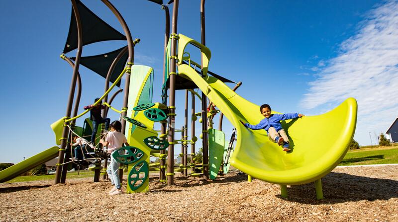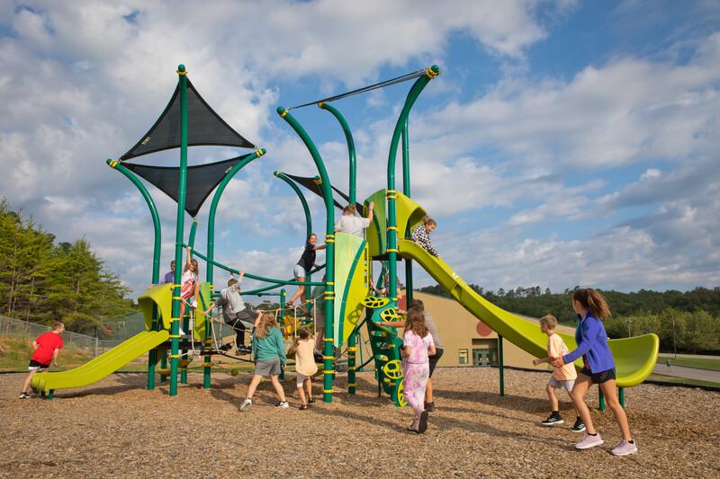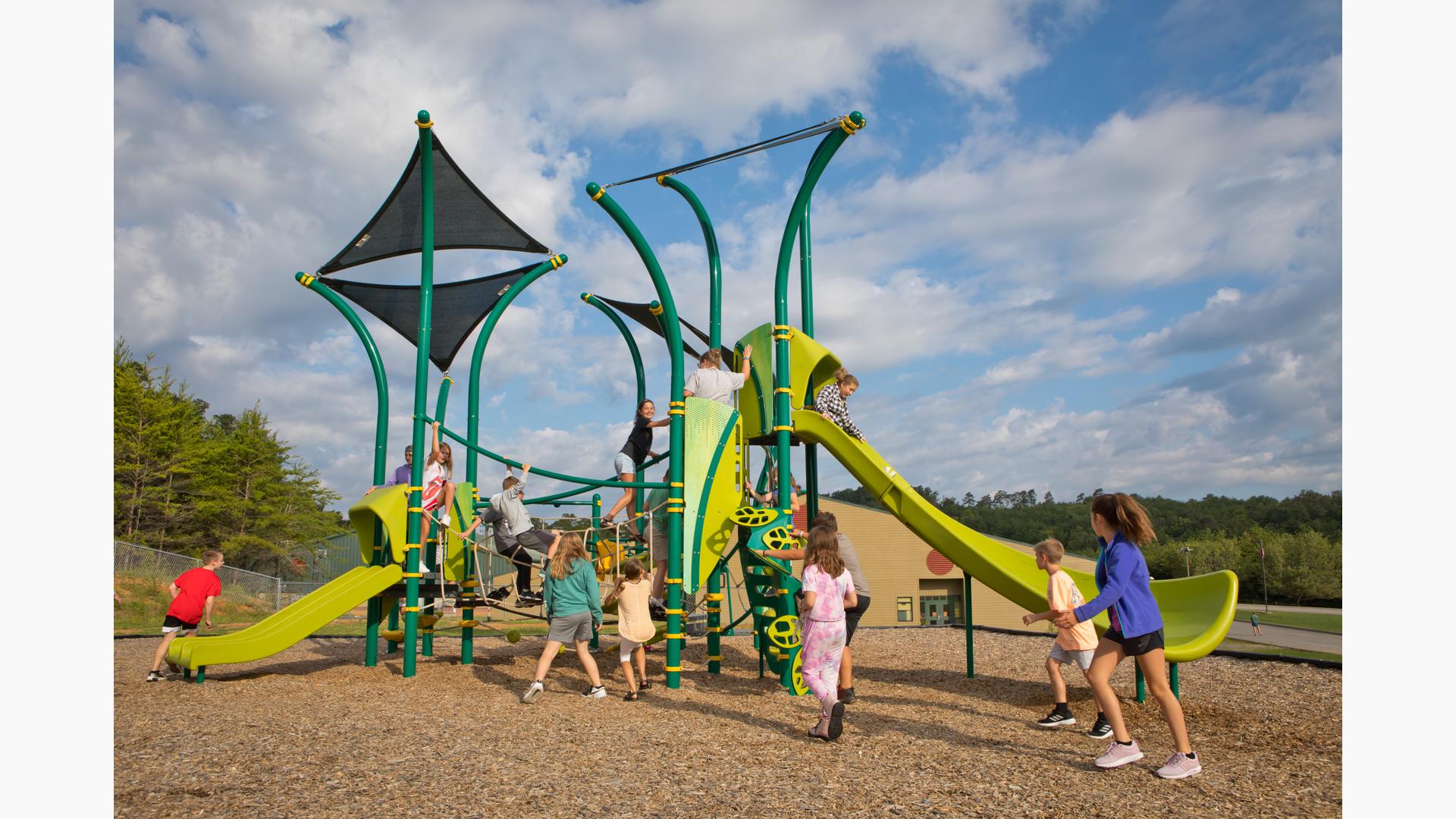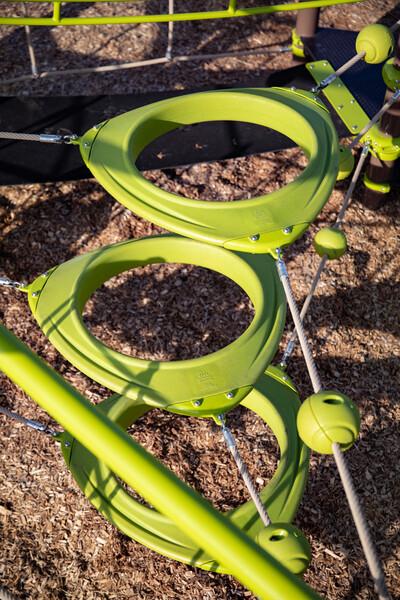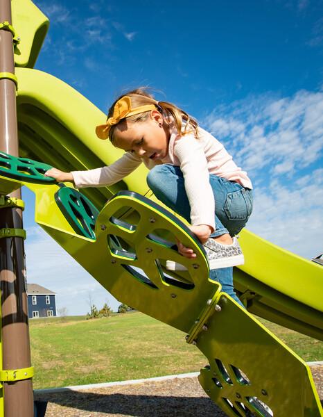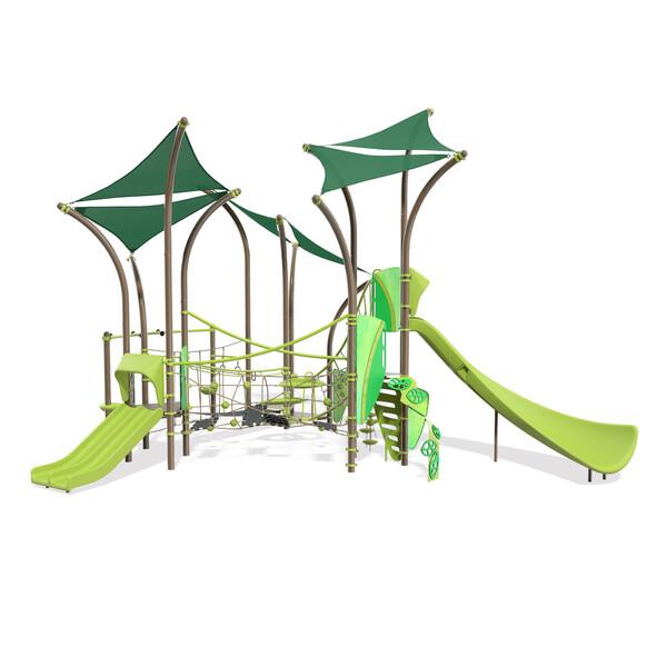 This wondrously abstract playstructure gives kids the sense of playing in the treetops, exploring a forest canopy branch by branch. But beyond the normal ups and downs of traditional tree-climbing, here kids also can navigate their way across wiggly bridges, crawl through the O-Zone® 3-Ring Climber, roar down two different slides, plus so much more.