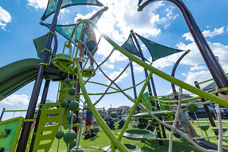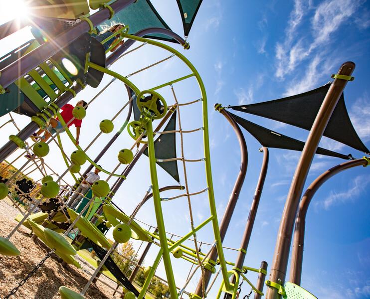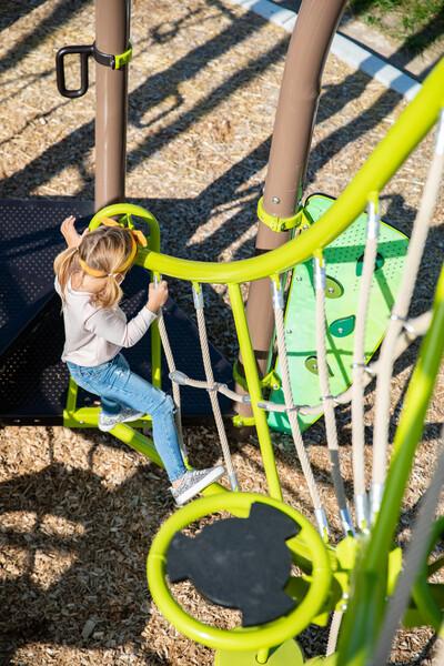 - Steel and cable climber with integrated SwiggleKnots® Bridge accommodates many kids at once