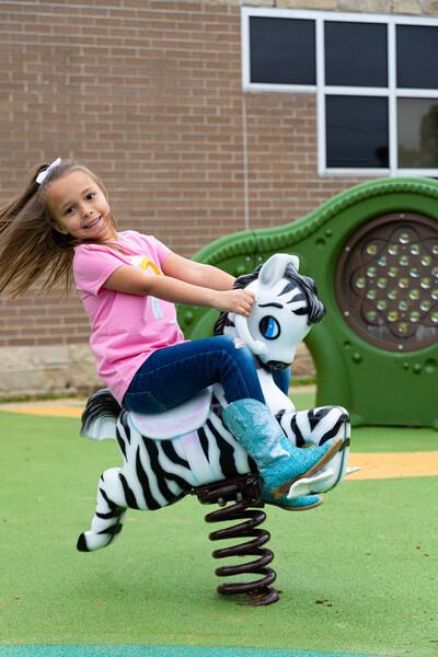 [video: the camera focuses on the girl’s feet as she rests them on the foot pegs of the spring rider. Camera switches to a side view of the two girls riding the spring riders as children shout and play on the playground nearby. Scene switches to a view of the girl’s hands as she continues to hold onto the hand holds and bounce on the Zebra spring rider. The camera pans downs form the girls smiling face to her feet as she continues to ride. Camera switches to a side view of the girl as she bounces on the Zebra rider. She bounces so far, she almost touches the ground with the back legs of the Zebra. Scene fades to black.]