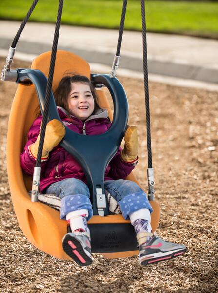 [video: Scene switches to a woman holding onto the push handles of a young girl’s wheelchair. Scene switch to a close-up of the woman’s hands while she pushes the girl in the wheelchair. Scene switches to the mother unclipping the Full Bucket seat harness. She picks up the young girl and positions her in the assisted ZipKrooz swing. Camera close-up of the woman latching the assisted swing harness. Scene switches to a child wearing a helmet with a camera attached to the top. The child’s hands can be seen grabbing the rope of the swing. The scene changes to a side panning view of a girl while she rides down the ZipKrooz bay. Scene switches back to the child wearing the helmet cam as they ride down the ZipKrooz ride. The scenes switch back and forth to the child wearing the helmet cam and the side view of the girl riding down the bay. As the scene switches back to the child wearing the helmet cam they look to the end landing zone of the ZipKrooz bay where a girl holds out her hand to grab the rider. The child
