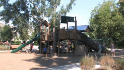 [video: music begins to play. Scene changes to a close-up view of the feet washing station with swing set in the background. Camera switches to an opening in the trees where a boat cruises past down the river. Camera view changes to looking up at a tall tree with the sun peeking through the branches. Camera close-up of a laminated piece of paper displayed reading: Welcome to Fourth Avenue North Playground. This unique playground was constructed with the help of many volunteers and much donor support. We would like to thank those supporters who helped make this play area possible.]