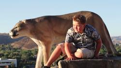 Camera close-up of the eyes of the mountain lion statue. Young boy stands and places his hand on the nose of the mountain lion statue. Five children sit in a line on top of the back of the large concrete snake. They all smile and look at the camera. A young girl and group of kids sit on top of the back of the concrete snake while smiling and waving at the camera. An older boy sits behind a baby girl on top of the concrete snake. He points at the camera to get the baby girl to look at the camera. Top down view of the mountain lion statues back as two children play below it. Two children climb up towards the camera next to the mountain lion statue. Young girl hugs the mountain lion statue while she smiles at the camera.]
