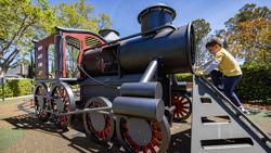 All aboard! The Alpine Park Playground in Burlingame, California provides adventure and imaginative fun for kids of all abilities. With two climbable trains and a water-tower train station replica, children will be taken back in history as they explore this bright and colorful play environment. After buying a ticket at the make-believe ticket counter, kids will be thrilled with the play possibilities that await them on this custom playground. Nets, climbing walls, a double slide and crawl tubes, these life-like train climbers will capture children’s imaginations and get them exploring. The train station and water tower structure invite young ones to climb high and take a ride down a twisty slide. What’s more, a swing set with toddler bay and an inclusive We-Go-Round® are fun ways to feel the exhilaration of motion. A train-track-themed pour-in-place surfacing ensures visitors of all abilities can access the fun, and shade structures overhead protect from the heat of the sun.
