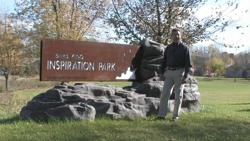 [video: fade into Steve King standing by a rock structure with a metal park sign reading: Barb King, Inspiration Park.]