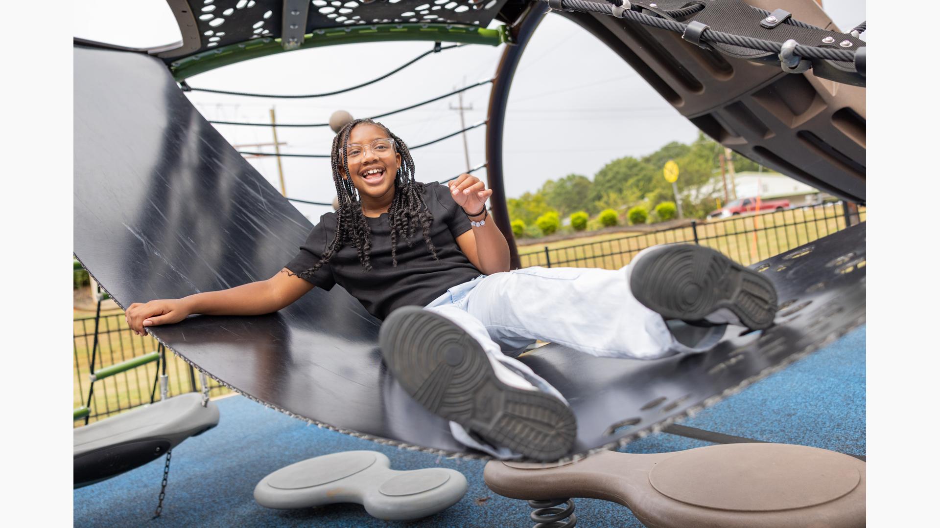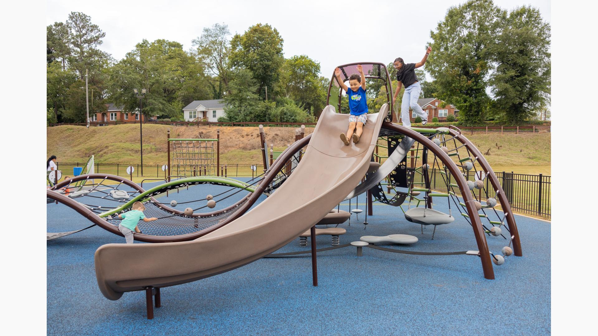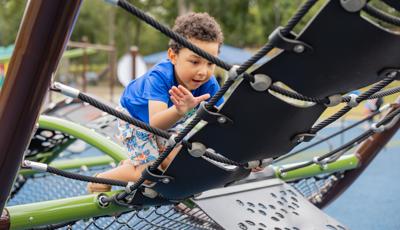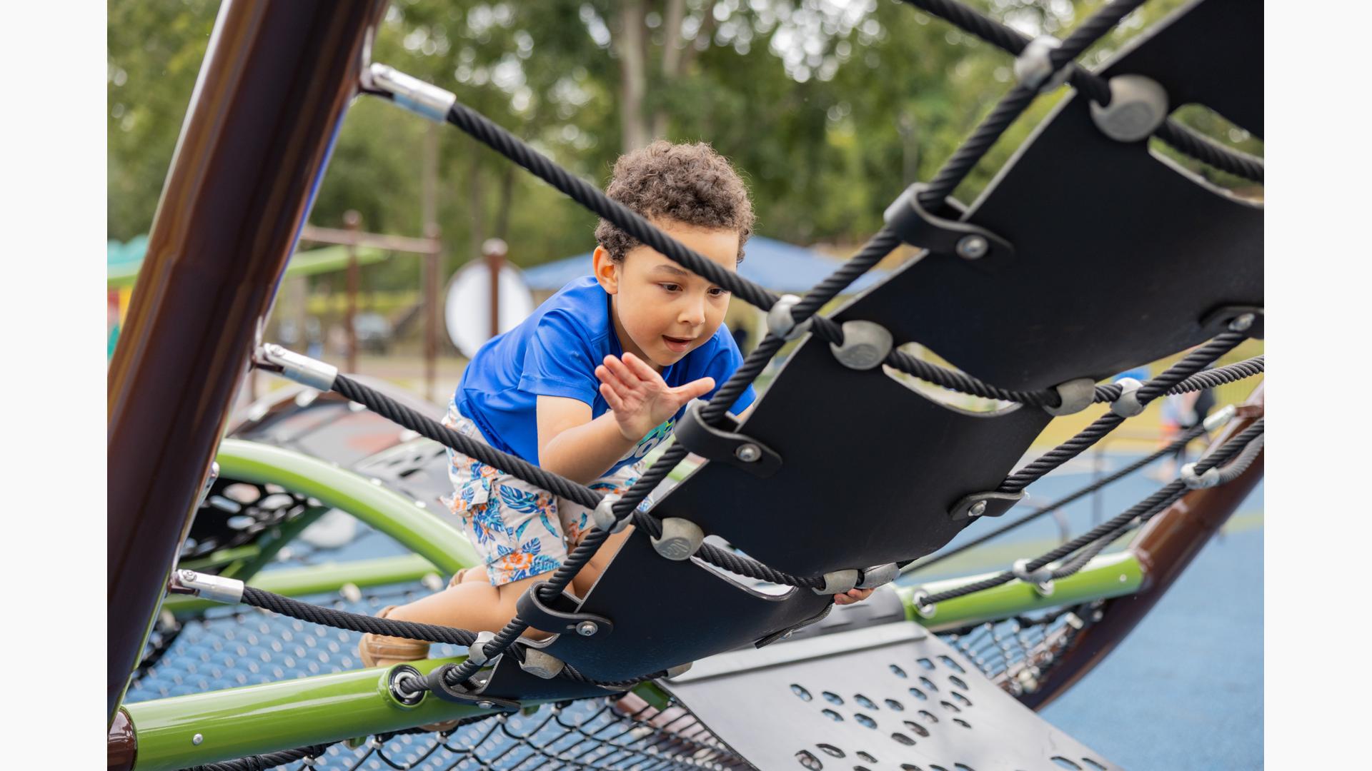 For those looking to climb and explore, a custom net-climbing structure provides the perfect setting for unscripted play. Designed like a wave, the climber appears to surf above the ground, while wobbly seats, steppers, and an Alpine Slide offer additional ways to engage. Finally, for kids who prefer a fast-paced thrill, a double-bay ZipKrooz® track ride is just steps away, featuring inclusive seating options for all-abilities play.