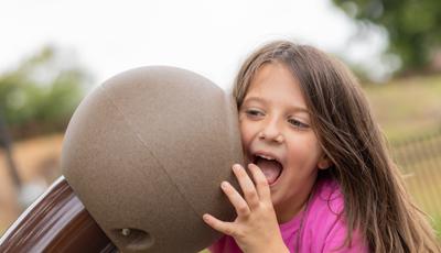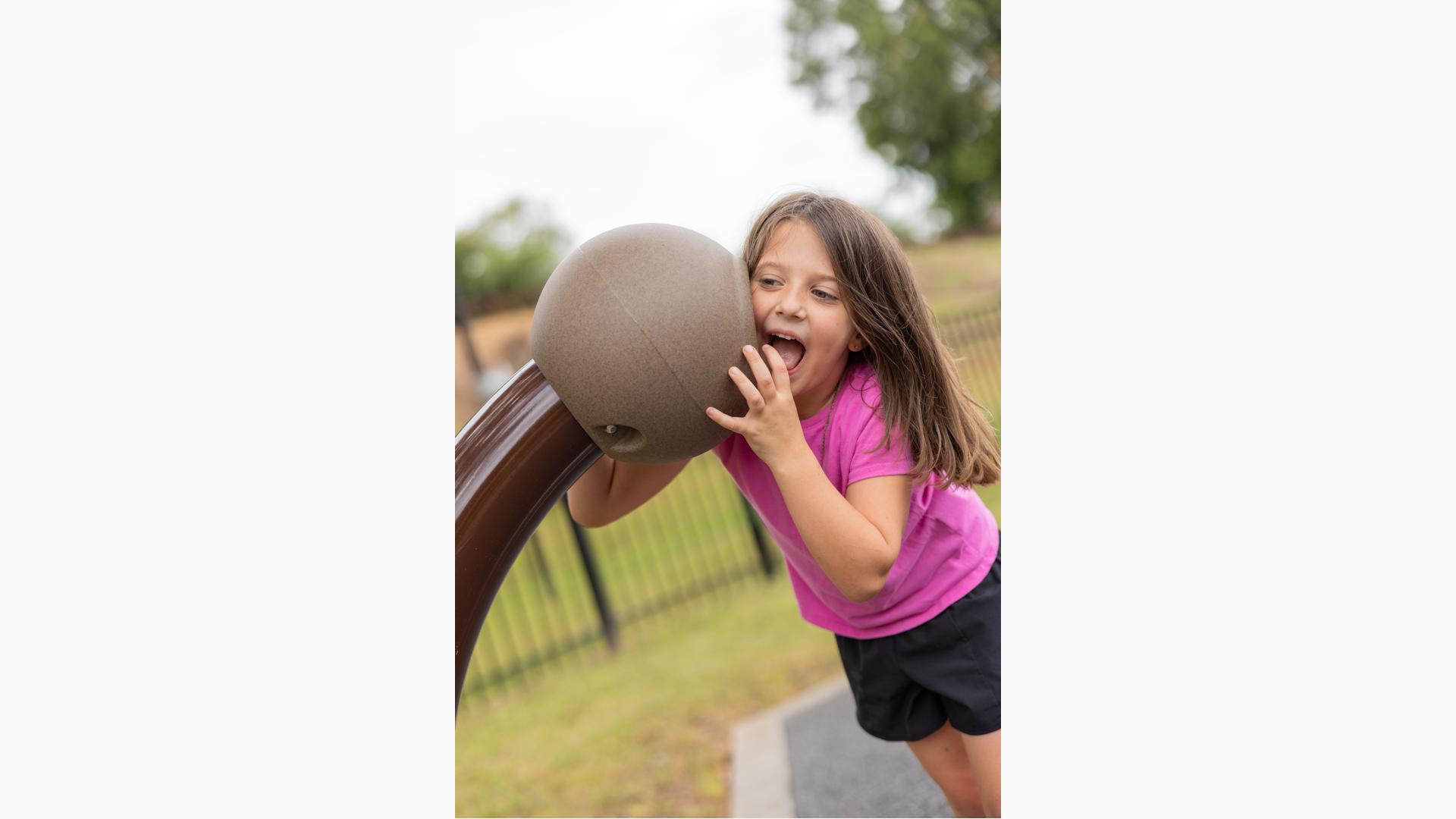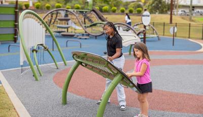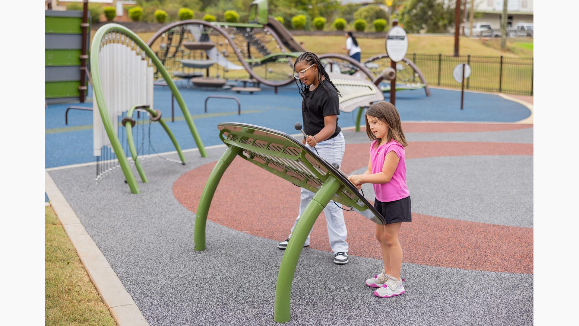 On the opposite side of the park, Rhapsody® Outdoor Musical Instruments await musicians of all ages, encouraging them to try their hand at hanging chimes, hand drums, and a giant xylophone.