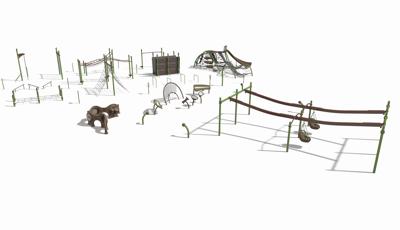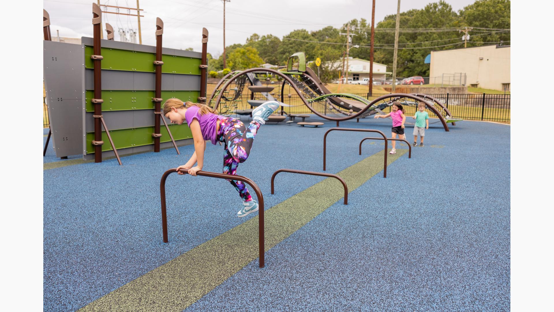 The fitness area is laid out in a serpentine pattern and offers a full-body workout for children ages 5 to 12. Featuring ten structures from the FitCore™ Extreme line of ninja-warrior-inspired products, this zone invites kids to challenge their bodies while having fun.