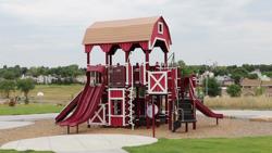 Contact Your ConsultantBritton Park in Arvada, CO., is home to a farmstead-themed destination playground. Two PlayBooster® playstructures look like barns and colored in their traditional red and white colors featuring plenty of climbing, sliding and exploring adventures. A custom tractor gets plenty of use by all park visitors. This playground keeps kids entertained and exploring for hours.