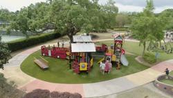 [video: scene begins with an aerial view of the entire park area. Shifts aerial focus to custom fire truck and station play structure. Kids climb on fire truck portion. The camera focuses on a DigiFuse panel printed with the Lakeland Fire Department shield. Scene fades to a ground level view of the fire truck and station play structure. Scene switches to a side view of a young girl scooching across custom roller table that's lined with fireman ladders on each side of the table. Camera switches to an elevated view of the play structure. Camera switches to a boy looks through yellow periscope. Scene switches to a young girl standing on the playground decking as she talks to the camera about her favorite parts of the playground.]