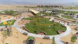 Cory B. Wride Memorial Park delivers a sprawling playground fit for the entire family. Positioned in the center of the circular playground design is a custom circle swing set complete with a variety of swing seats. Moving out from the center, kids will find the Netplex® playstructure, Global Motion®, Sway Fun® glider as well as a playstructure designed for toddlers and preschoolers. Even further out, visitors will meet the Mobius®, Aeronet® and AdventureScapes® climbers. And hillside climbers and slides are covered with a SkyWays® shade structure to help keep equipment and users cooler while they enjoy the ride.
