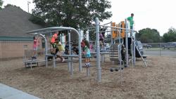 [video: Camera switches to a ground level view of children playing all over the playground. Text appears on the bottom of the screen reading: packs twenty exciting activities.]
