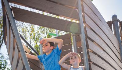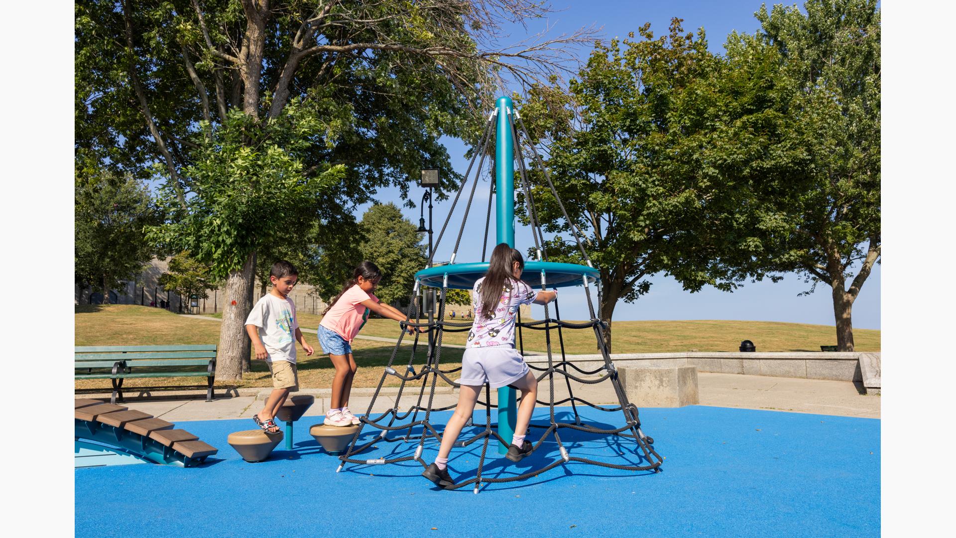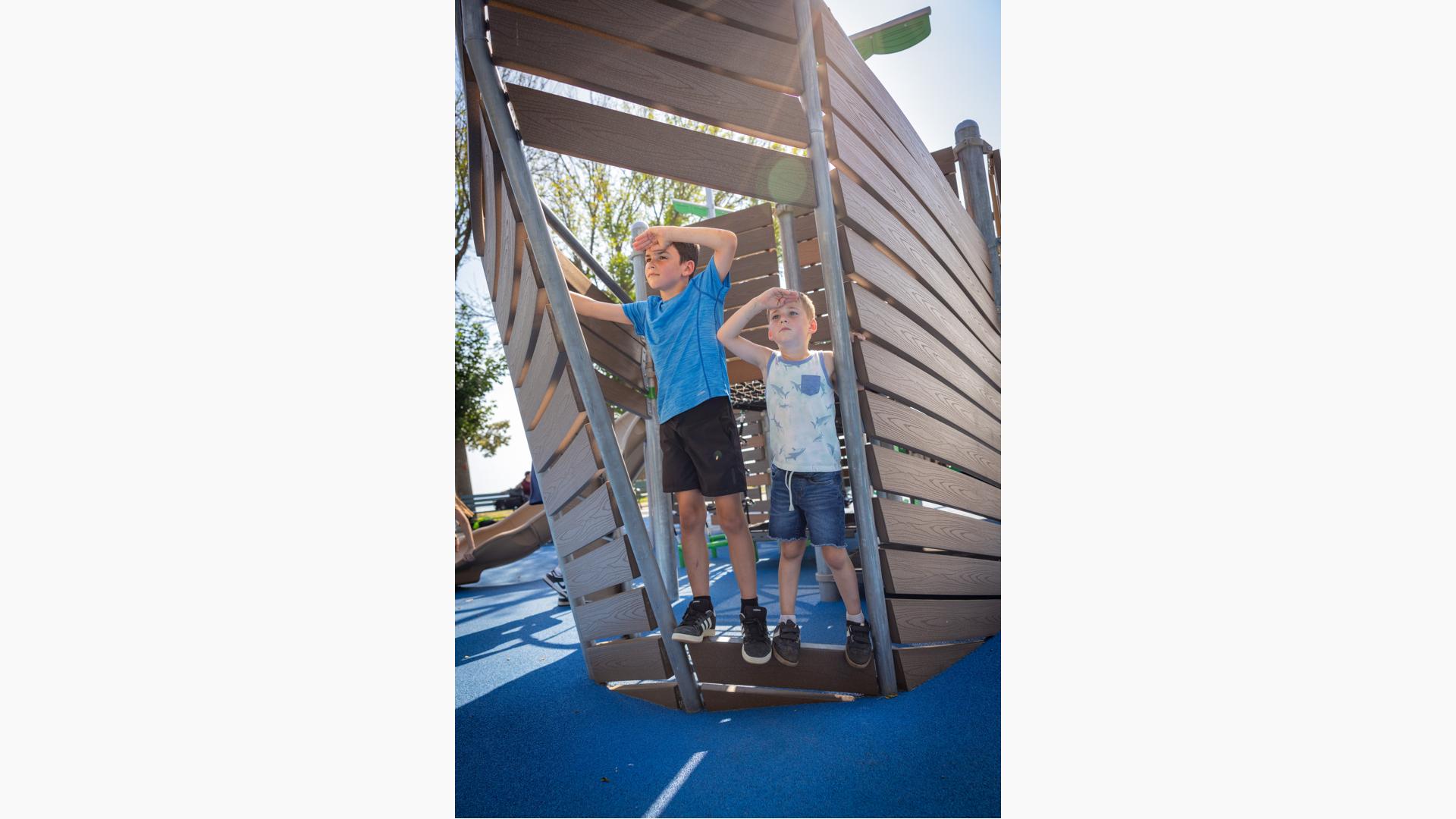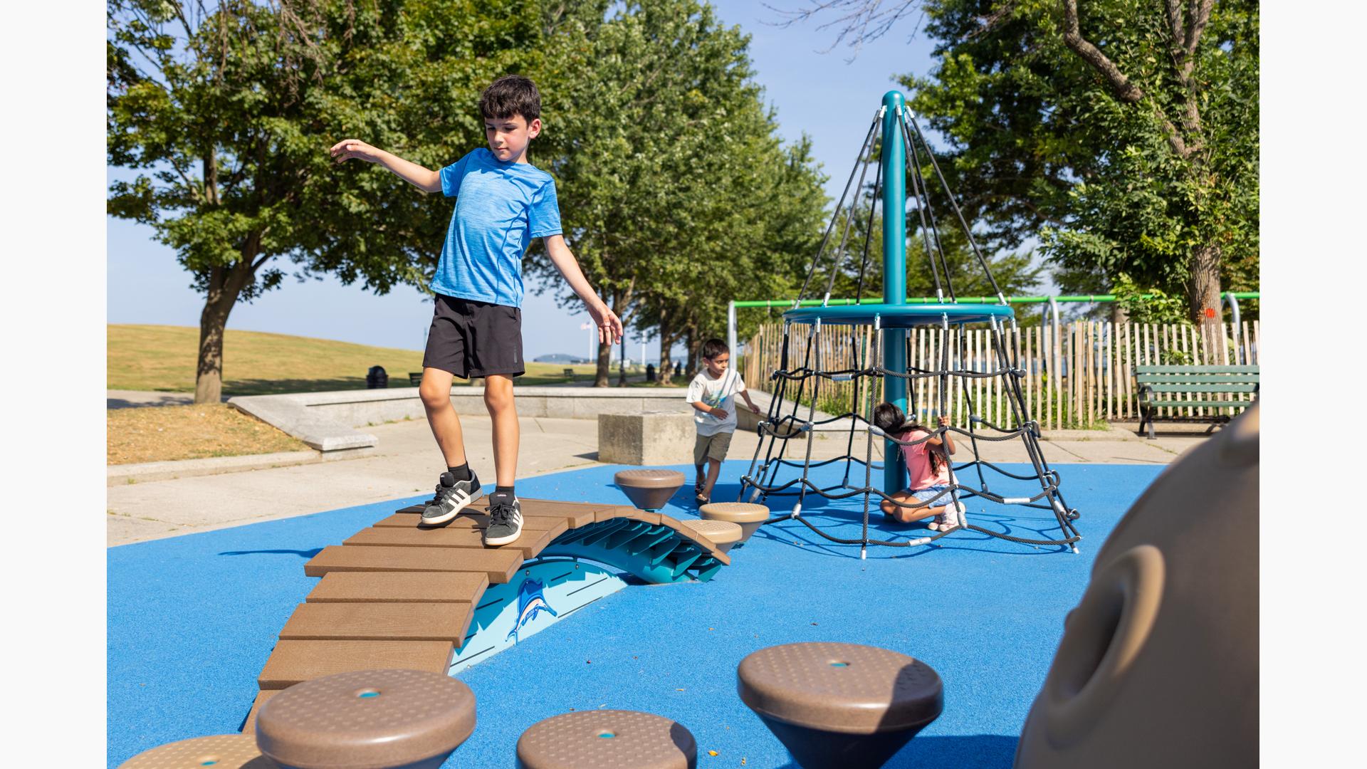 At its heart, a custom net-based structure ripples like the waves of the harbor, pulling children into a world of climbing, swaying, and continuous motion. Tensioned cables, flexible belting, and rope pathways stretch, dip, and respond underfoot. Steps away, a ship-themed PlayBooster® structure reflects local culture and history. Mast-inspired posts and recycled plastic lumber paneling echo the language of the waterfront, inviting children to captain their own adventures.