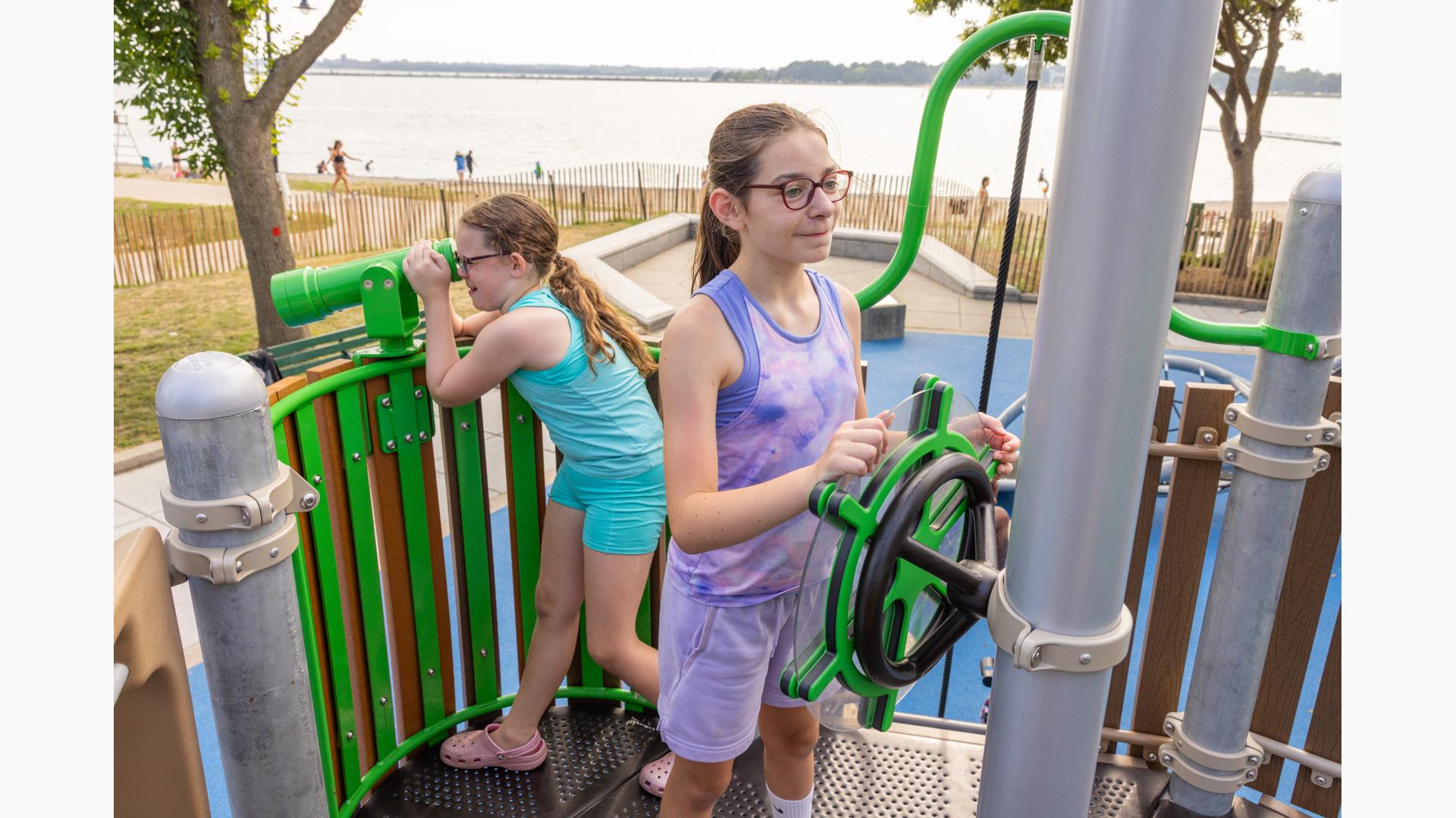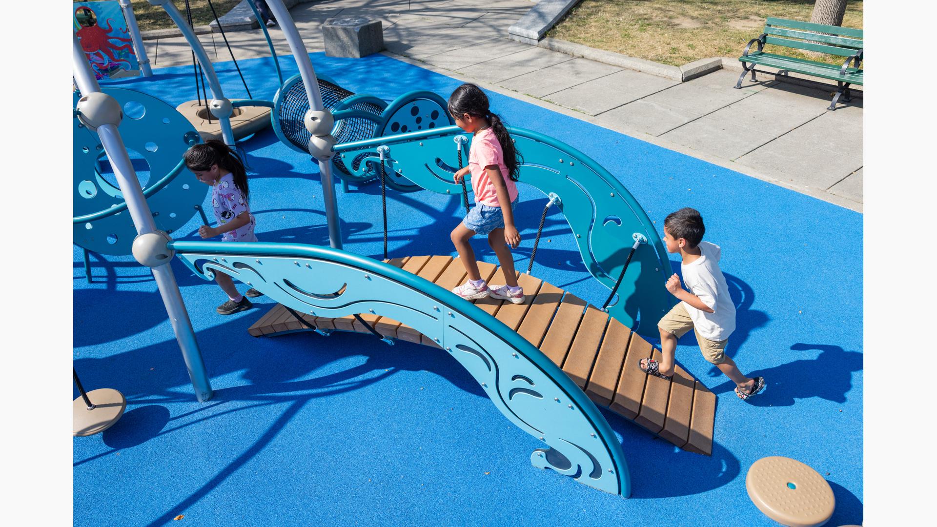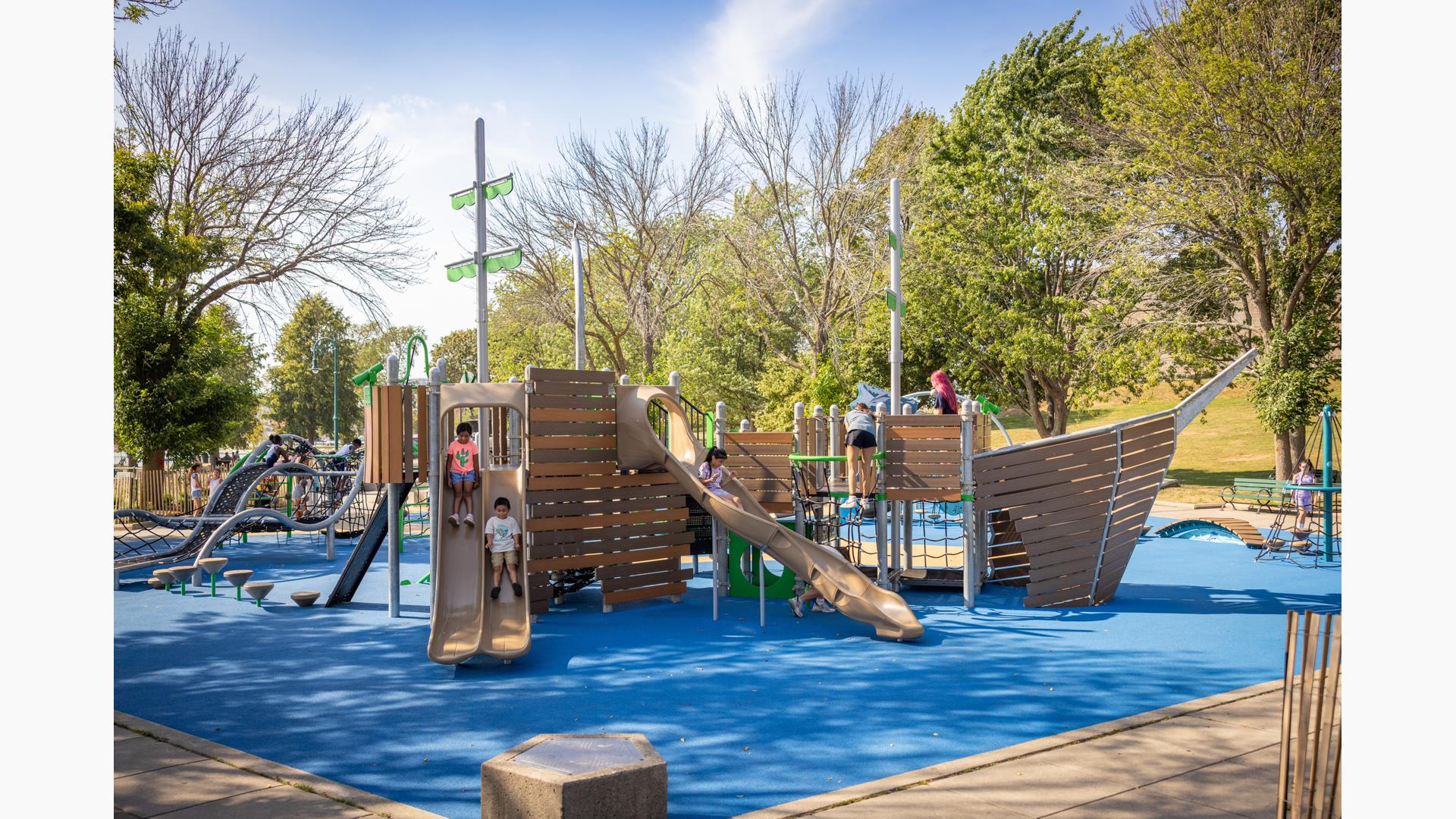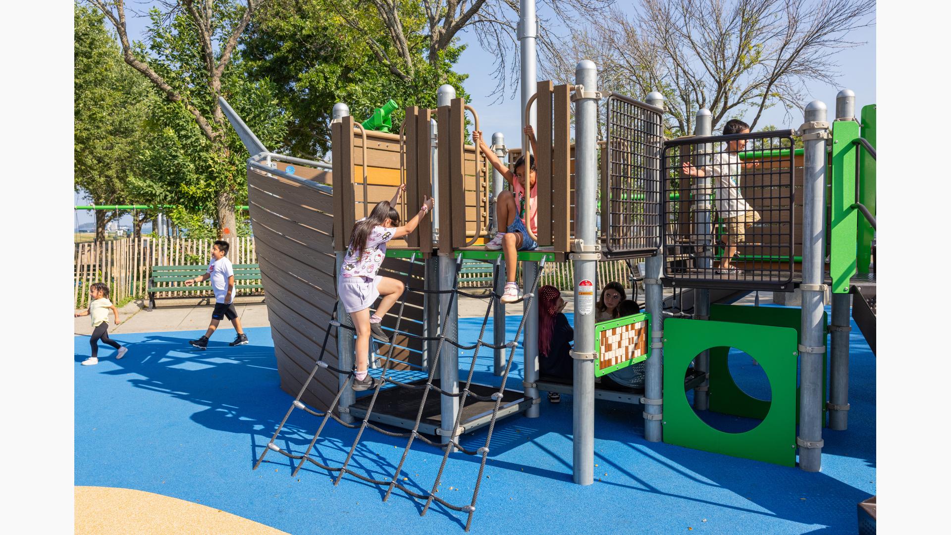 At its heart, a custom net-based structure ripples like the waves of the harbor, pulling children into a world of climbing, swaying, and continuous motion. Tensioned cables, flexible belting, and rope pathways stretch, dip, and respond underfoot. Steps away, a ship-themed PlayBooster® structure reflects local culture and history. Mast-inspired posts and recycled plastic lumber paneling echo the language of the waterfront, inviting children to captain their own adventures.