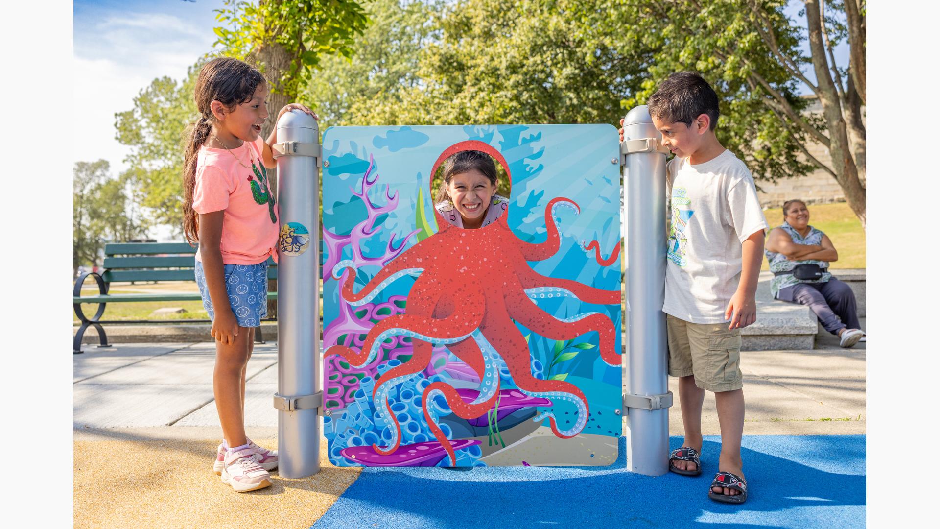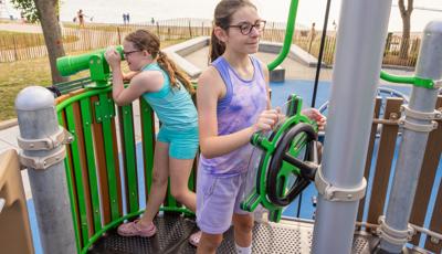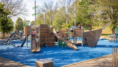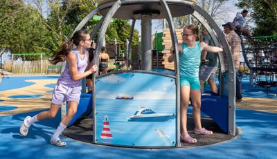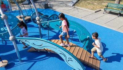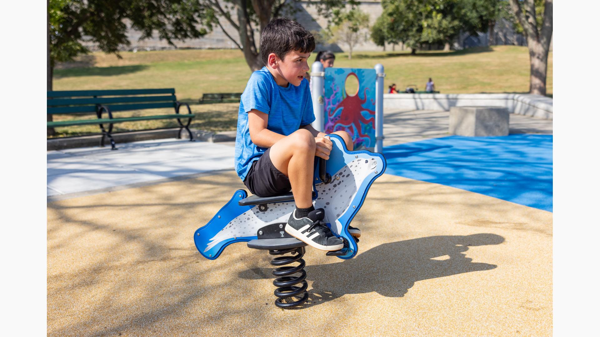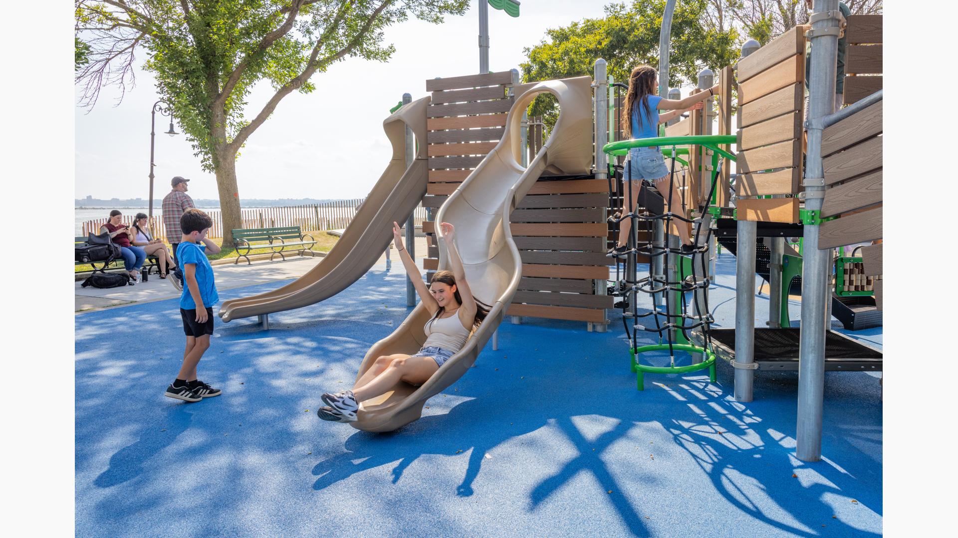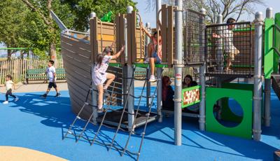 At its heart, a custom net-based structure ripples like the waves of the harbor, pulling children into a world of climbing, swaying, and continuous motion. Tensioned cables, flexible belting, and rope pathways stretch, dip, and respond underfoot. Steps away, a ship-themed PlayBooster® structure reflects local culture and history. Mast-inspired posts and recycled plastic lumber paneling echo the language of the waterfront, inviting children to captain their own adventures.