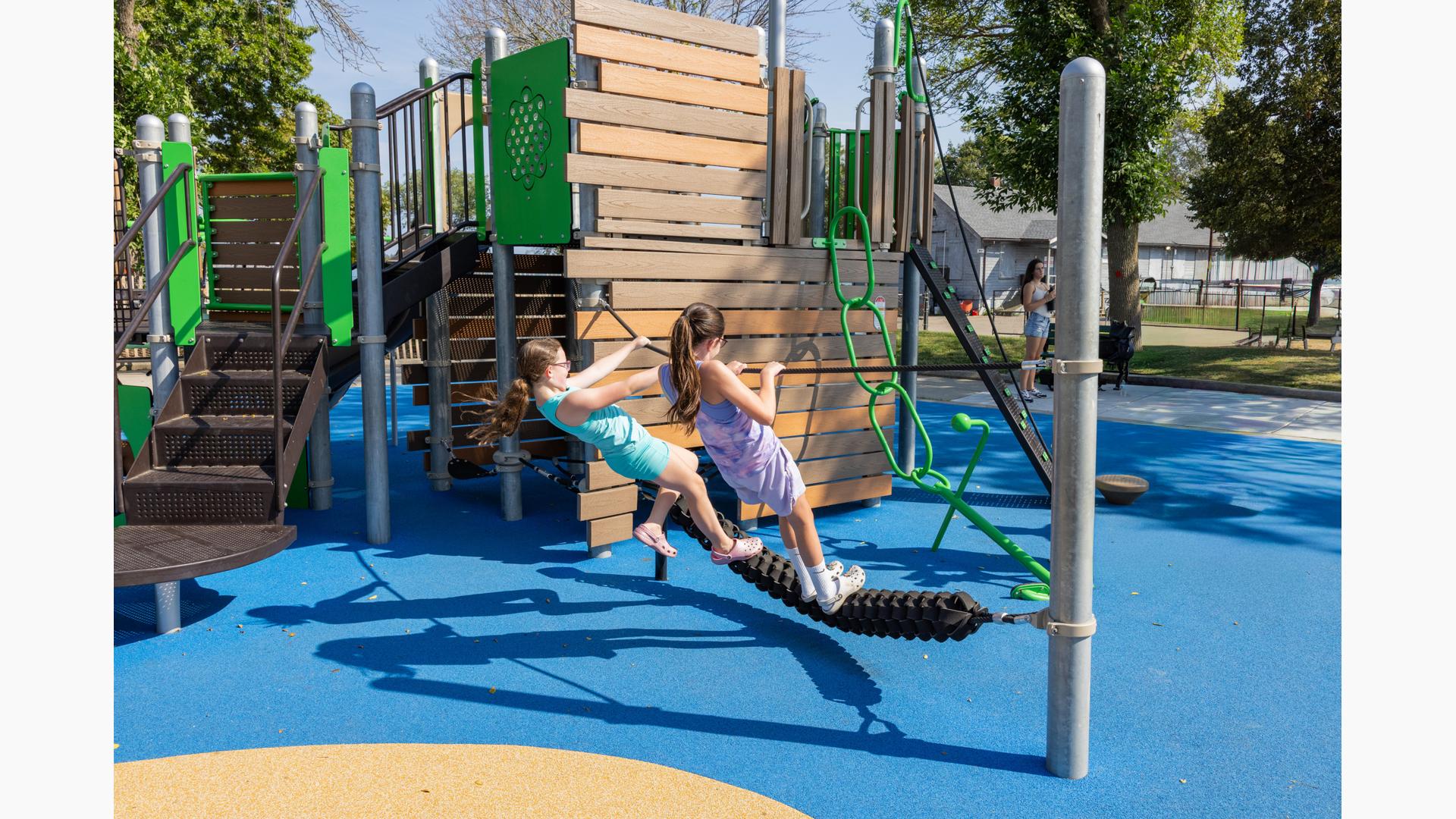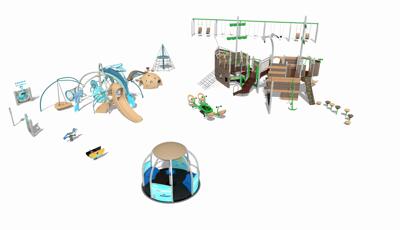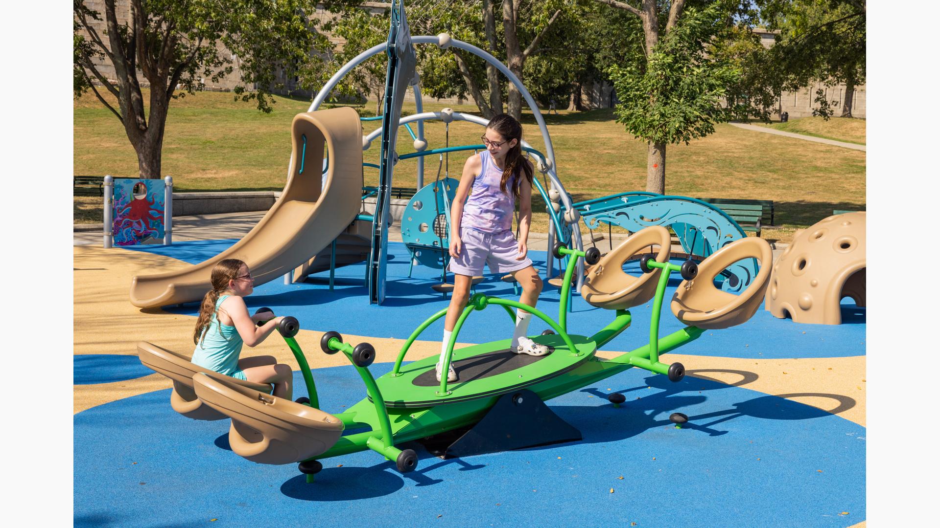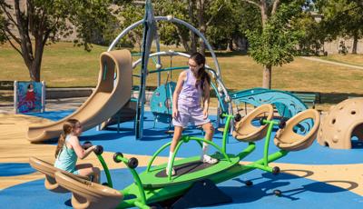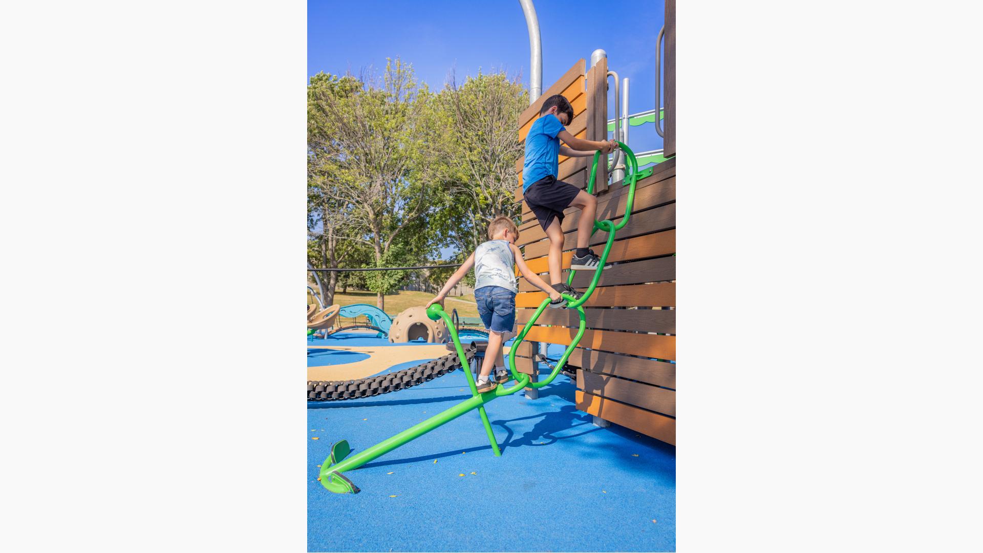 Inclusive, freestanding experiences extend the energy of the space. The multi-user, wheelchair-accessible We-Go-Round® and the We-Saw™ create shared moments of spinning and swaying, while a Weevos® play structure offers an age-appropriate environment for preschoolers to climb, explore, and build confidence at their own pace.