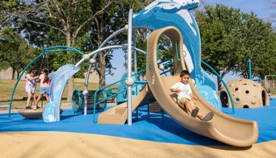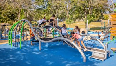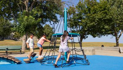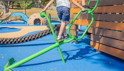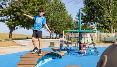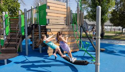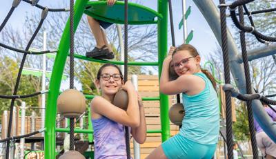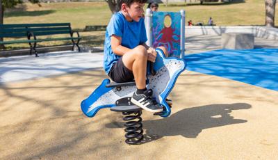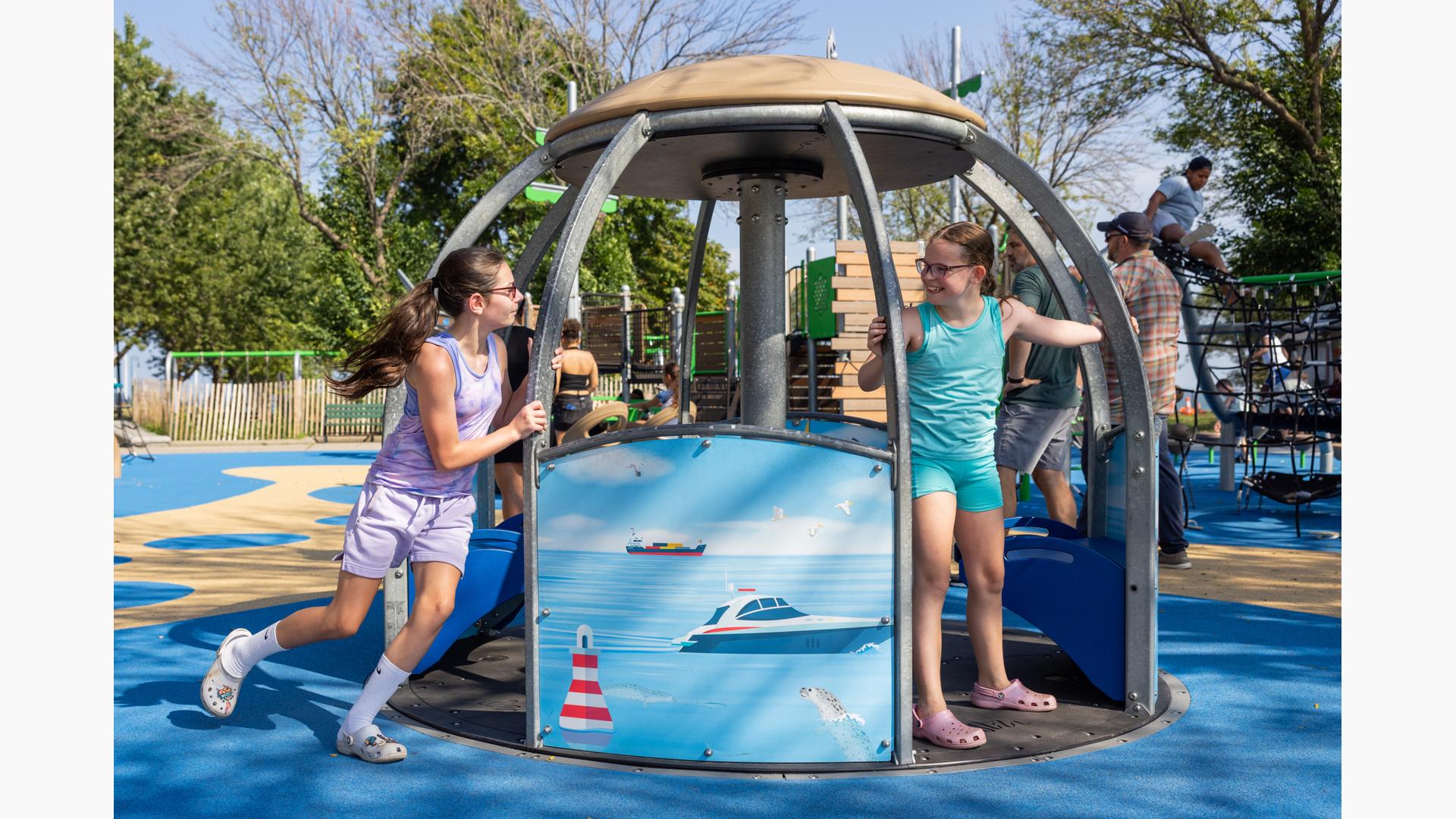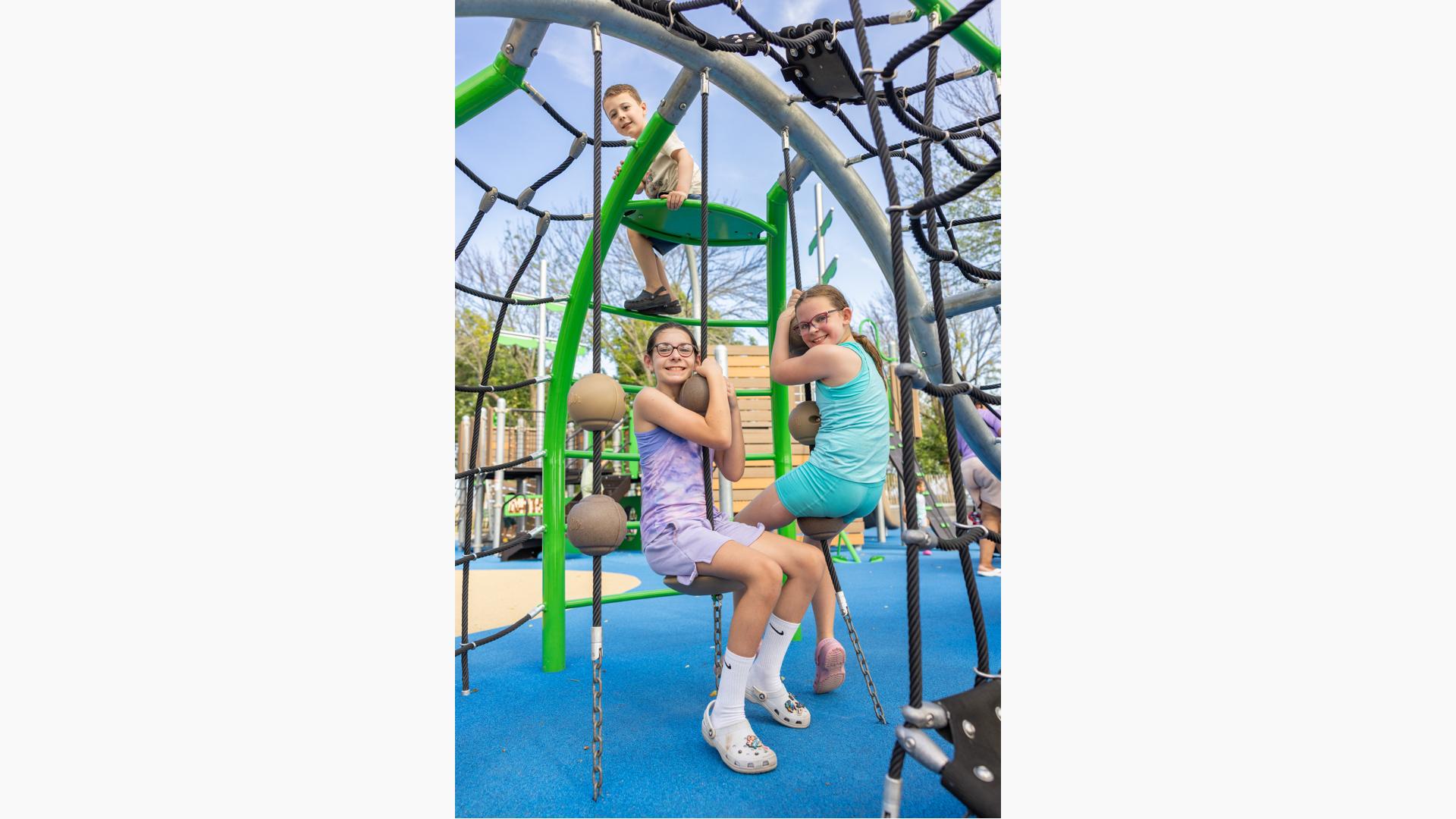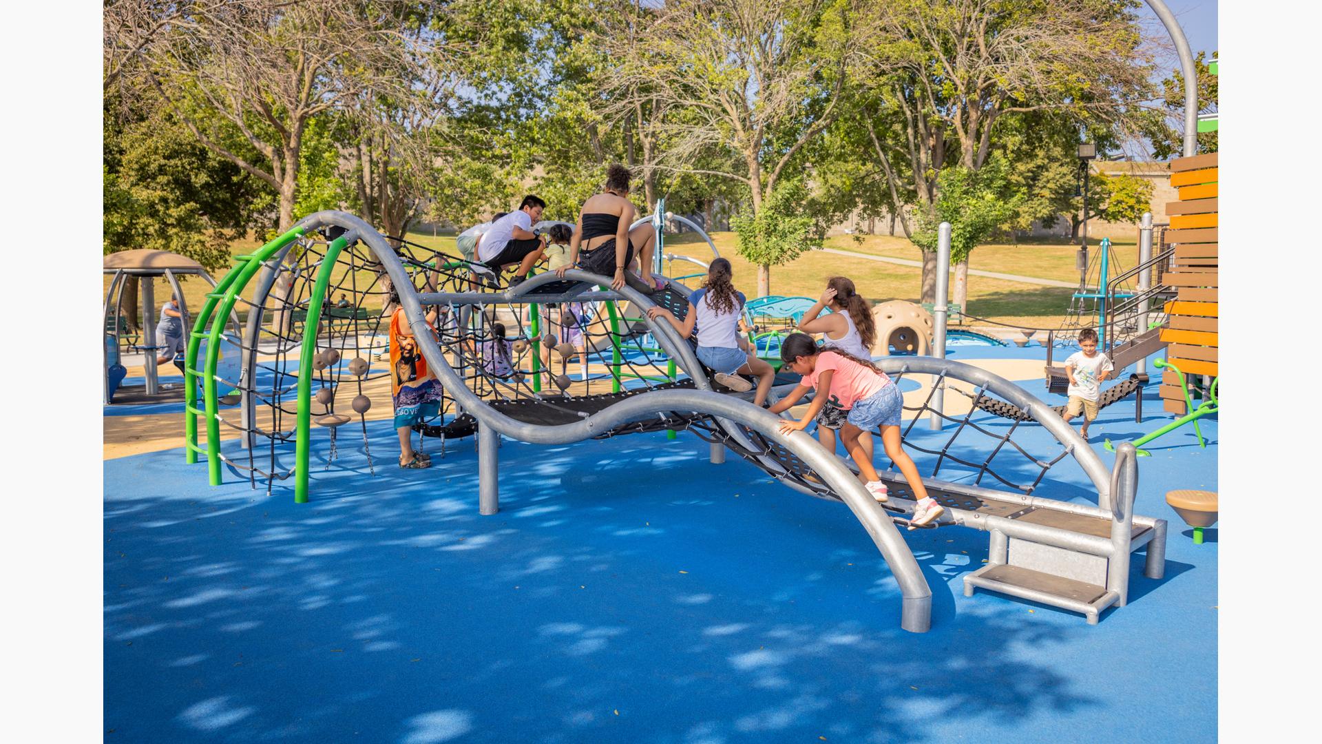 Inclusive, freestanding experiences extend the energy of the space. The multi-user, wheelchair-accessible We-Go-Round® and the We-Saw™ create shared moments of spinning and swaying, while a Weevos® play structure offers an age-appropriate environment for preschoolers to climb, explore, and build confidence at their own pace.