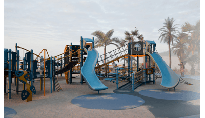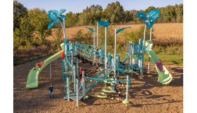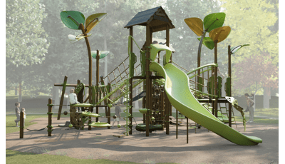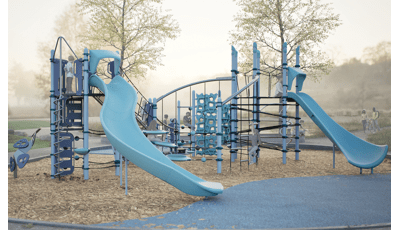 The Flowy Circuit keeps kids in continuous movement where every climb, bridge and slide connects seamlessly into the next. Net-based and layered challenges like the O-Zone® Array, SwiggleKnots® Bridge Inclined and Slack Line engage balance, coordination and responsive engagement while vertical routes on the VertiGo™ Deck-to-Deck Climber, Corkscrew Climber and Lotus™ Climber offer multiple ways to ascend and descend. Momentum carries children from one level to another while the FlowWinder™ Slide adds a speedy way down. Each stacked level encourages parallel play, choice-driven exploration and continuous engagement where the whole system is greater than the sum of its parts.