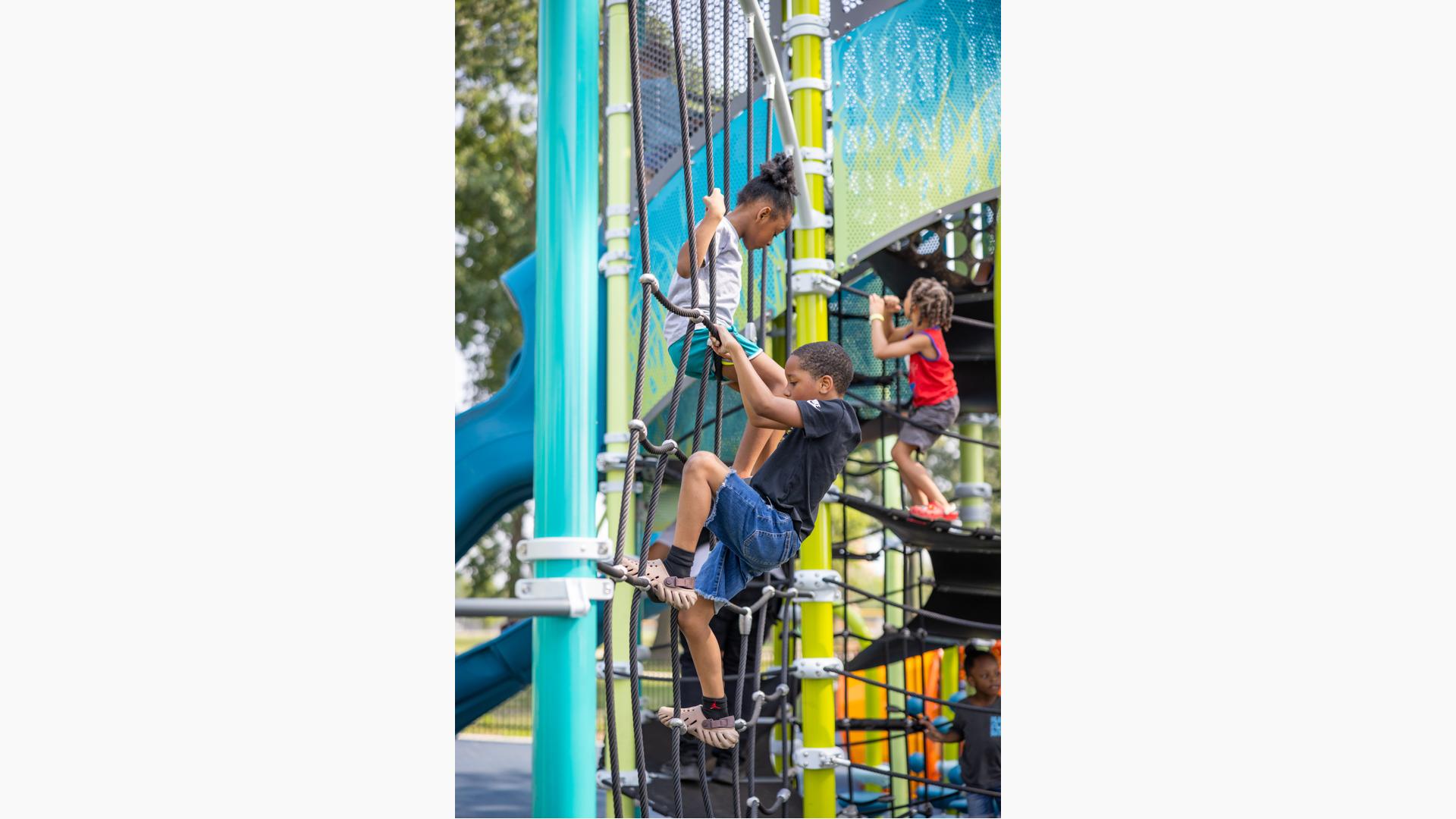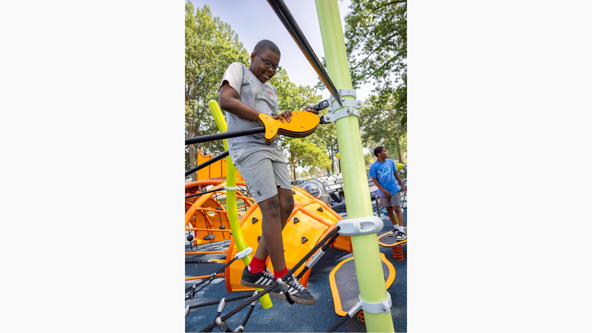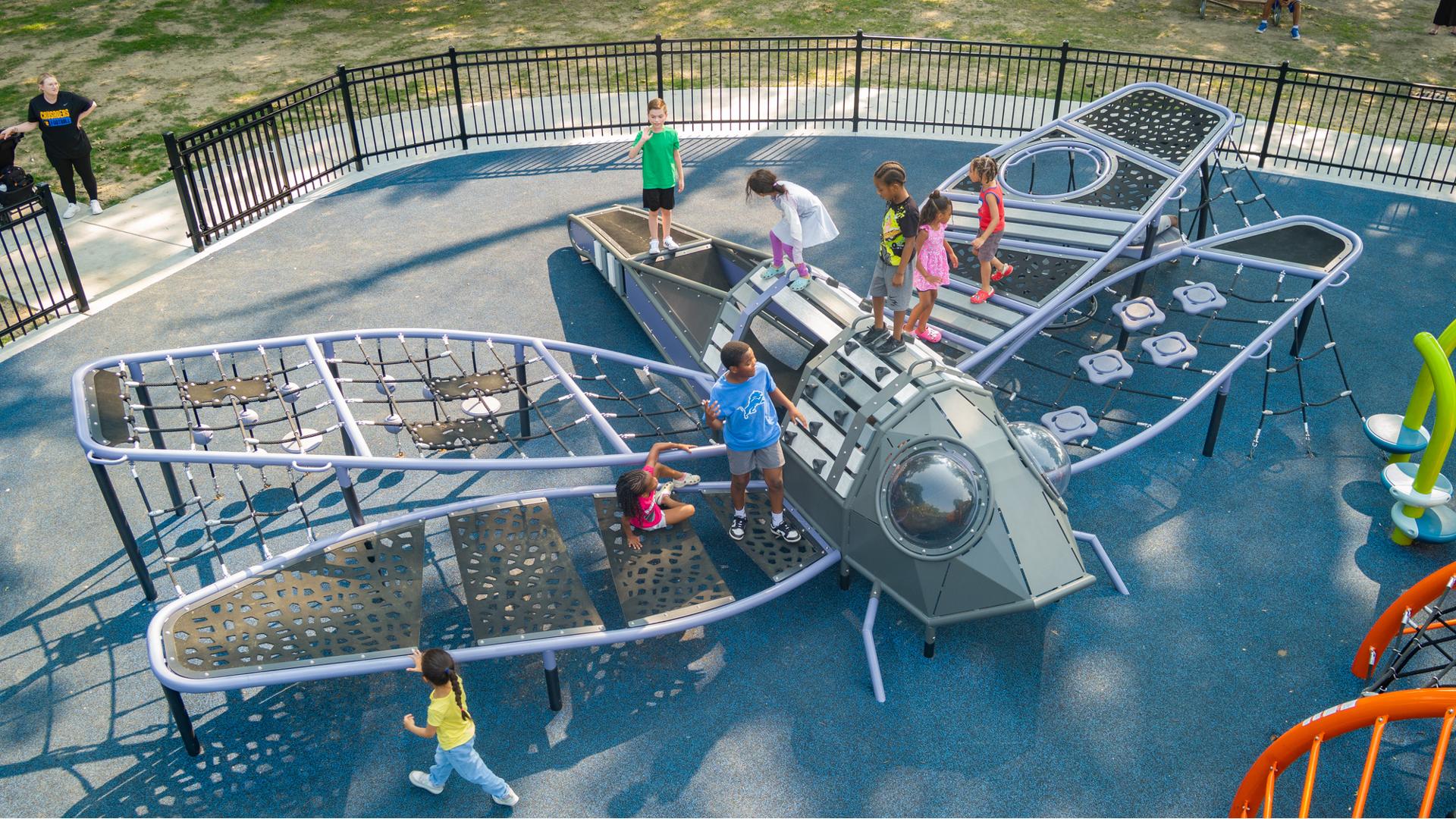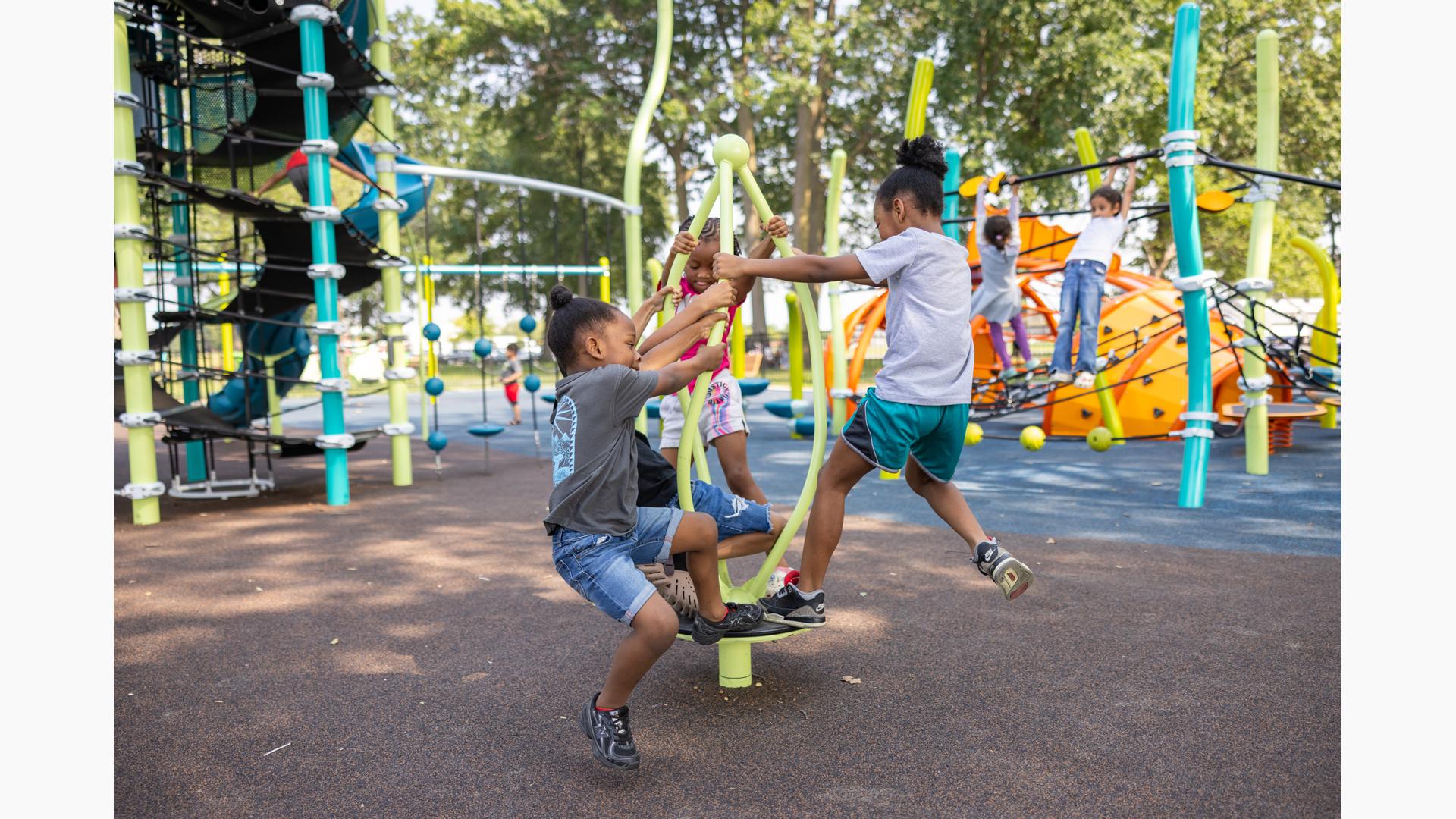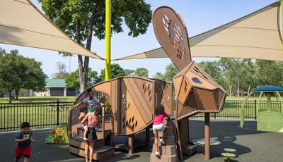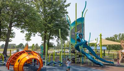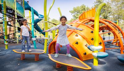 The geometric rabbit climber offers climbing inside its sculptural, angular frame, while the lake-grass-themed 12' Super Netplex® Tower includes slides, adjacent steppers, a Swiggle Stix® bridge, and net-climber, all that mimic waving reeds. Additional inclusive features like the We-Go-Round® and We-Saw® encourage cooperative play, while SkyWays® shade sails and rubberized surfacing ensure comfort and safety. Ford Woods Park combines natural inspiration, accessibility, and imaginative design for a playful, community-centered experience.