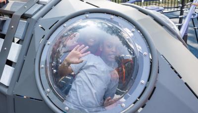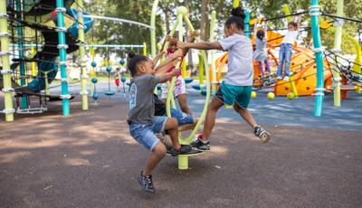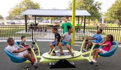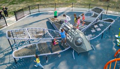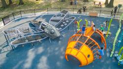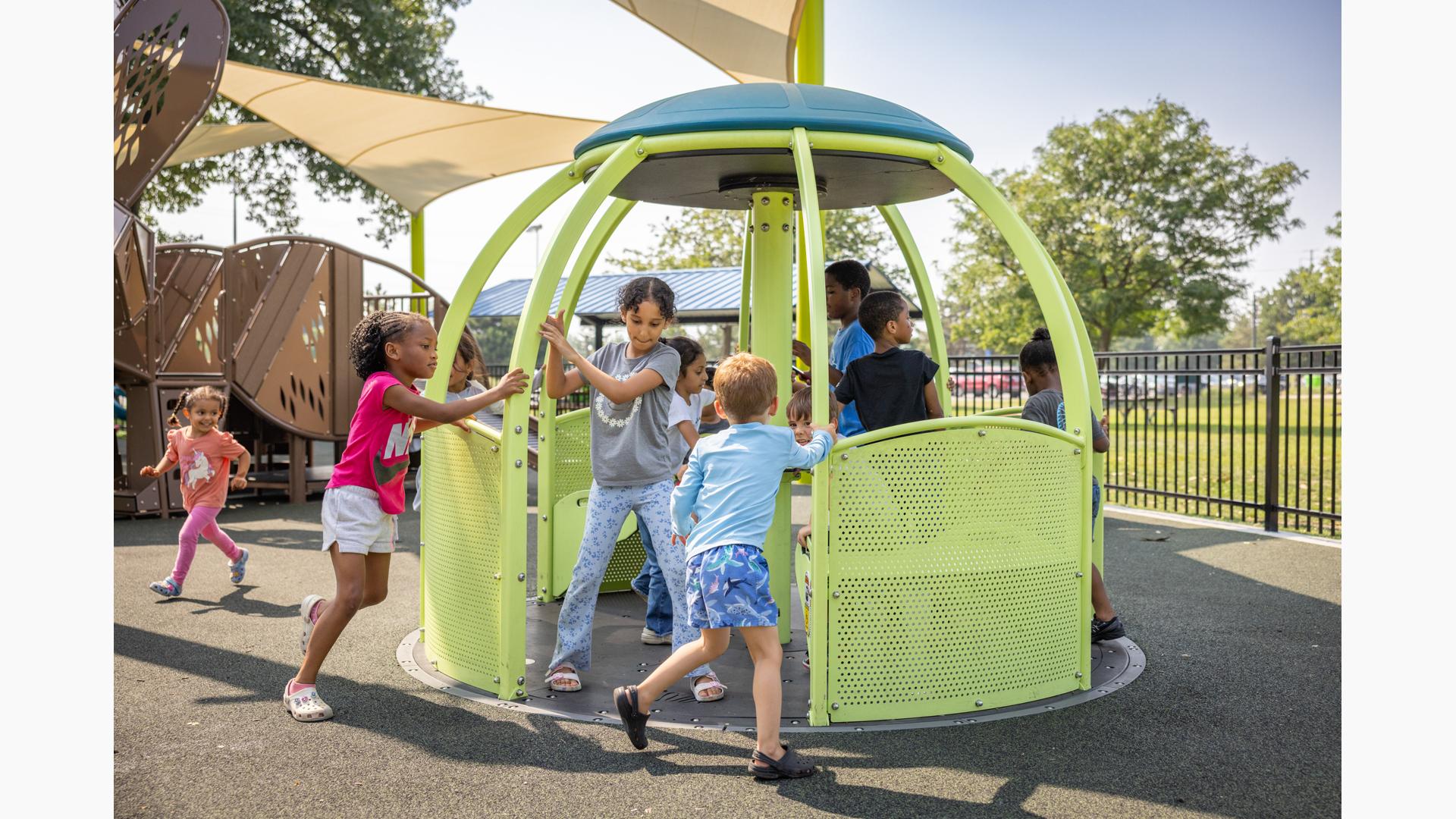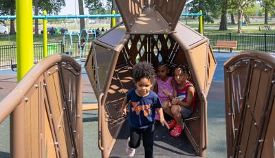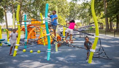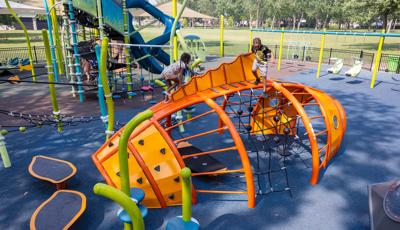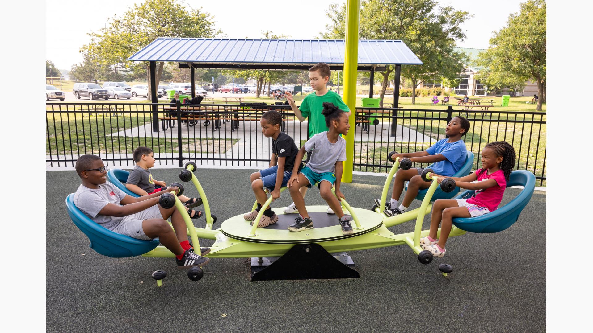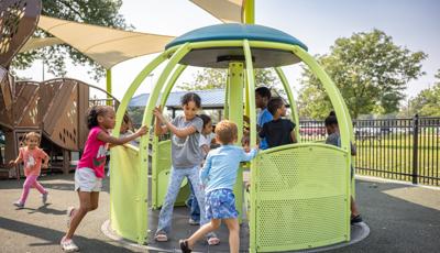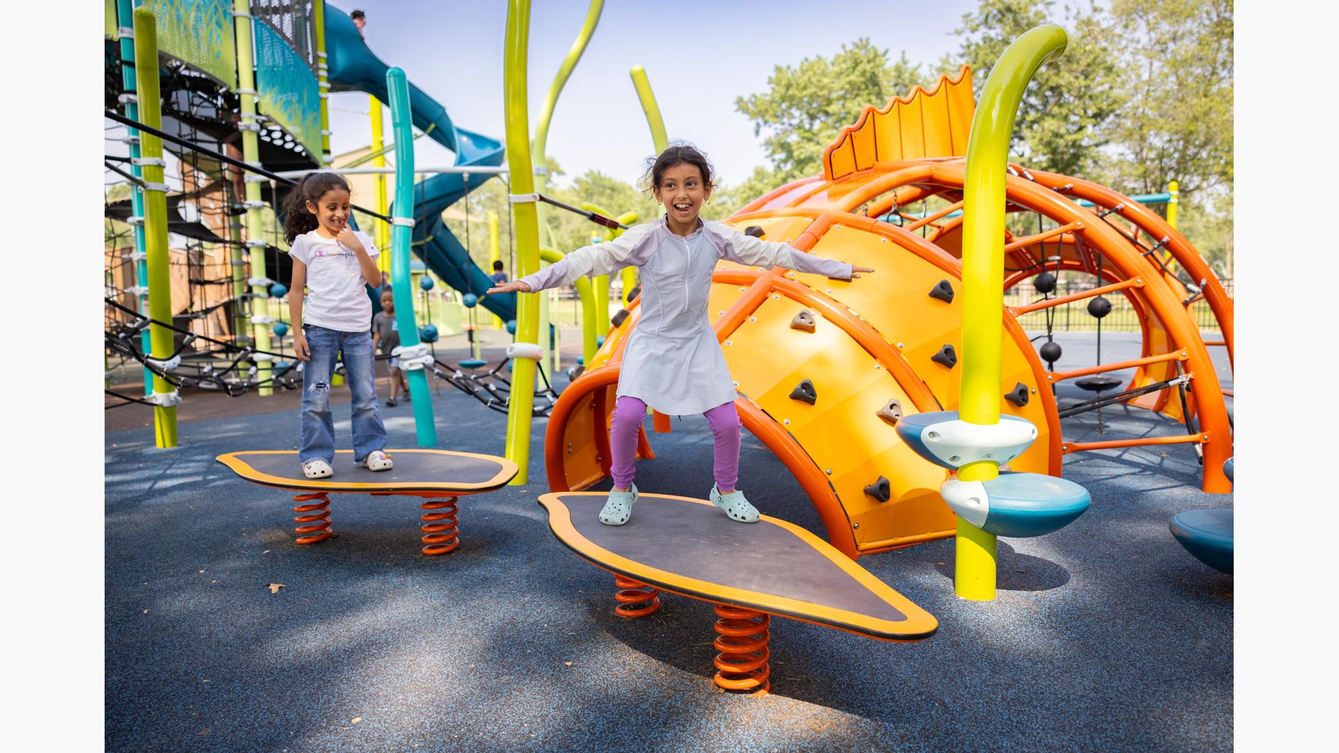 The geometric rabbit climber offers climbing inside its sculptural, angular frame, while the lake-grass-themed 12' Super Netplex® Tower includes slides, adjacent steppers, a Swiggle Stix® bridge, and net-climber, all that mimic waving reeds. Additional inclusive features like the We-Go-Round® and We-Saw® encourage cooperative play, while SkyWays® shade sails and rubberized surfacing ensure comfort and safety. Ford Woods Park combines natural inspiration, accessibility, and imaginative design for a playful, community-centered experience.