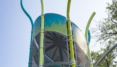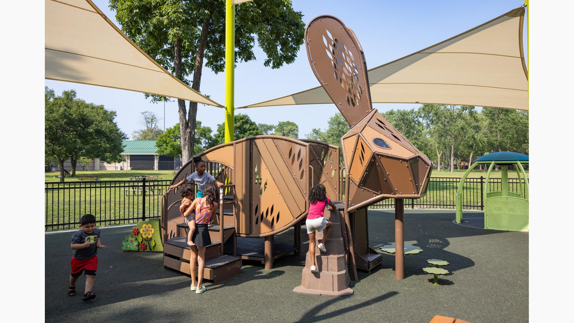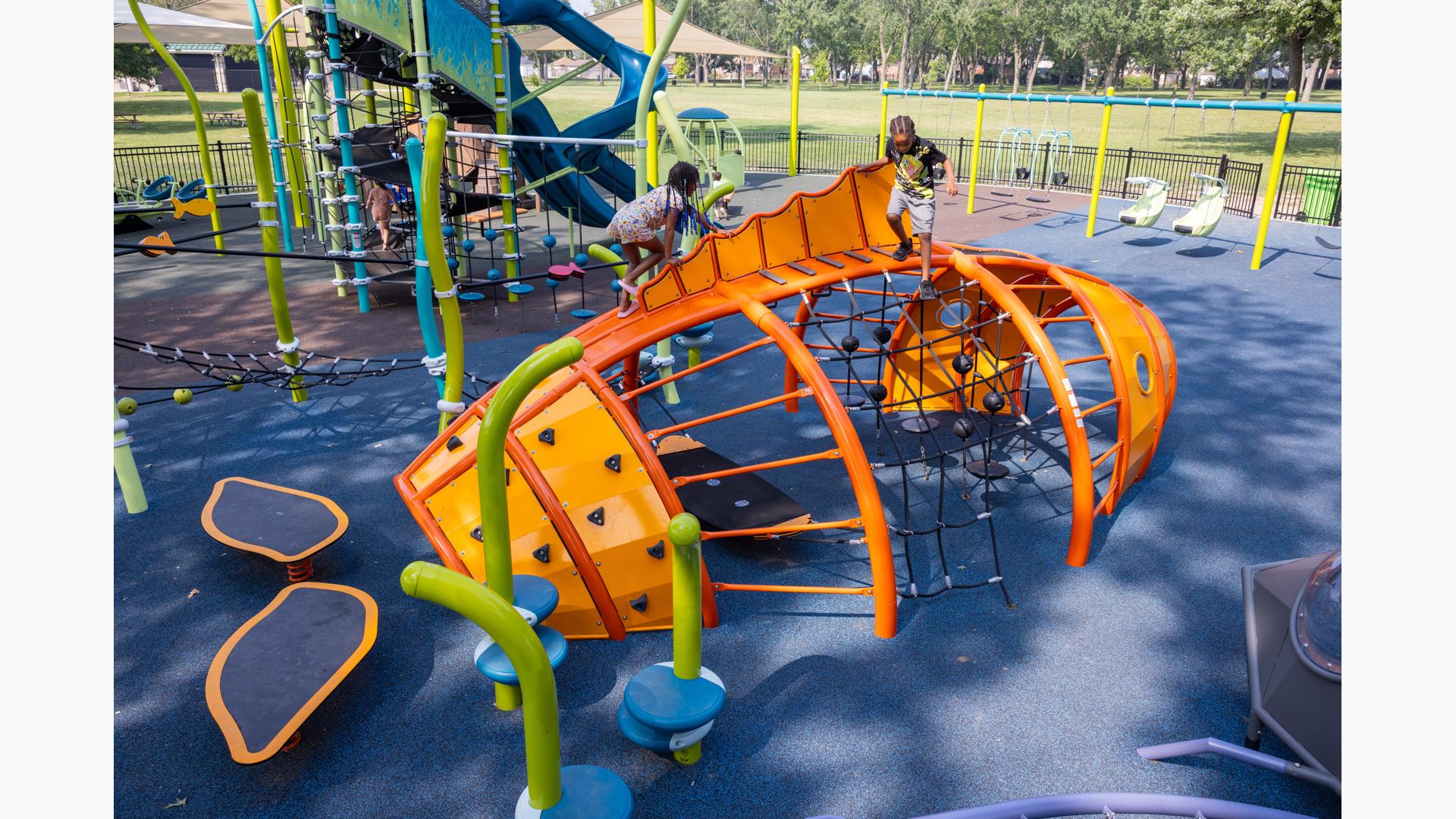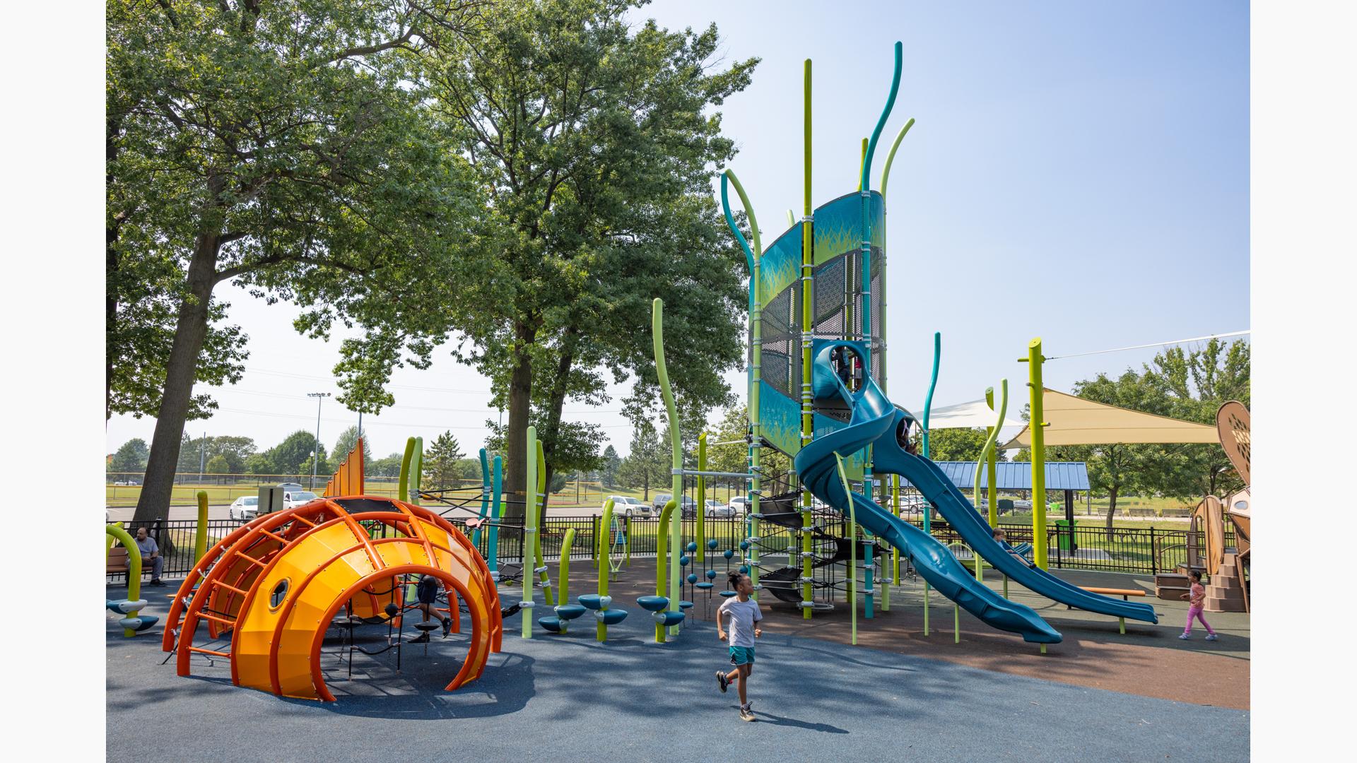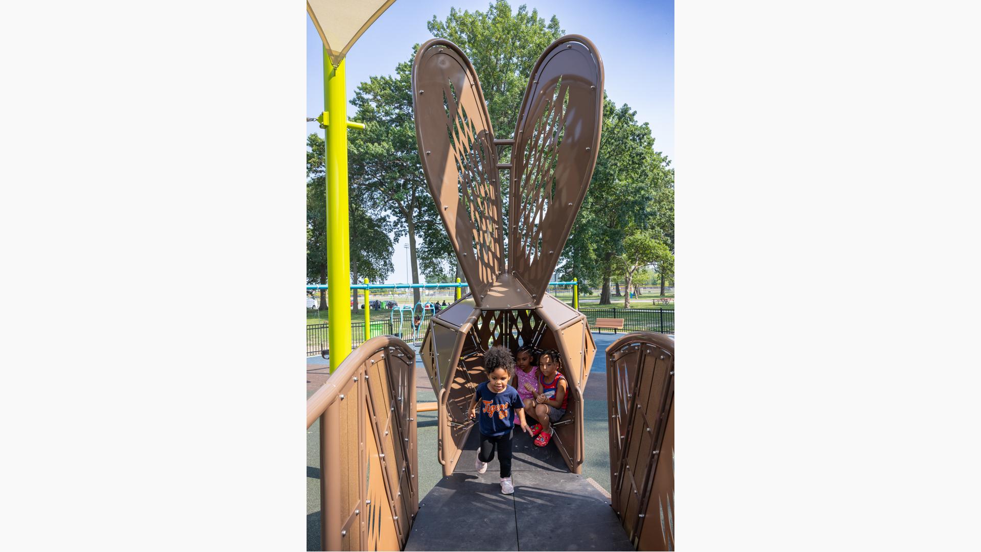 Design files are not available for this custom design. Contact your local playground consultant for additional details.Discover a world of local nature and inclusive play at Ford Woods Park in Dearborn, Michigan, where children of all abilities can climb, play, and explore. This public city playground features custom animal climbers—a rabbit, a dragonfly, and a fish—that invite local wildlife to play through innovative design.