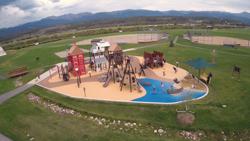 [video: an elevated view of the school house, Fraser Mercantile Co, and the Jail house playground structures. Camera switches to ground view of the back side of the three building structures where slides and climbers are located. Children run all around. Two boys play on the Fraser Mercantile Co double slide as another boy begins to climb on the Starburst Climber. Camera view rotates to the side of the school house structures where children walk past the camera and a young boy swings on the hangs on the Ring-a-Ling monkey bars. A young girl slowly slides down towards the camera on a roller slide. A young girl sitting on a painted pot stepper taps her hands on a taller stepper in front of her. Camera close up of the side of a horse statues face. Camera switches to a full view of the spider web climber with the teepee structures and stage coach structures in the background. Elevated view of the back side of the jail house where a girl stands at the top of the logo climber. A young girl spins around on a low chin up bar. Camera back to Michelle speaking the last view words of her voiceover.]