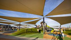 Custom farm-themed PlayBooster® towers built on a hillside and elevated on stilts provide endless play opportunities at this exciting destination playground and adjacent Aquatix® splash pad. Slides, cable net climbing, sensory exploration, ziplining and more are made accessible for all children to enjoy. Extensive ramping and a number of inclusive play structures, like the Cozy Dome®, OmniSpin® Spinner, We-Go-Round® and Oodle® Swing make this playground friendly to kids of all abilities. Ideal for the Arizona sun and heat, the playground is thoughtfully covered with shade structures that enable play to continue all day long.