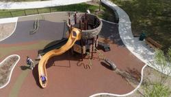 [video: overhead view of children playing on play structure. Kids climb across and up climbers and go down slide. Scene switches to young boy looking out of birds over the lake with a telescope. He then goes down long slide.]