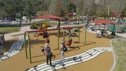 [video: kids file off a school bus to the play area. The children walk in a group under the Shane’s Inspiration playground arch way. In fast forward a crowd of children walk towards and past the camera on a sidewalk. The scene fades to a full elevated view of Griffith Park as children wander and play on the many different play areas. Text at the bottom of the screen reads: The park sits on 2 acres.]