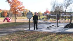 [video: scene fades into a man standing by the Health Beat outdoor work out area. He stands closely by a playground sign reading: HealthBeat Outdoor Fitness System For Ages 13+ A healthy community starts here.]