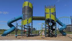[video: the camera focuses on a girl’s feet as she walks up the spiral belt path of one of the towers. The camera pulls back with a view up the tower as children climb all over the ropes and belt paths. Scene switches to a full side view of the Double Swoosh Slide. Two girls ride down the slide with their hands raised in the air. Camera switches to a inside view of the tower at the top of the TurboTwister Tunnel Slide. A girl waits at the top of the slide for her turn. Scene switches to a ground view up to a child as they crawl through the elevated crawl tunnel between towers.]