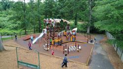 [video: camera switch to adult pushing boy in wheelchair down playground structure ramp.]