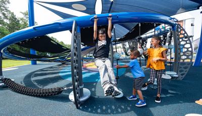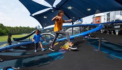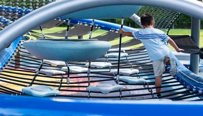 [video: full view of a figure eight shaped play structure with slides, climbers, cargo netting, and belted stepping pads. A large shade system designed with stars shades the large structure. Camera switches to a different angle of the figure eight structure as children play on unique belted climbers. A girl pushes a boy on one of the belt climbers like a swing. Camera pans the underside of the figure eight structure showing the climbing ropes and cargo netting. A boy climbs down from the top layer of the figure eight structure onto triangular suspended climber pods. Camera focuses on a child’s hands as they hold onto the tighter woven cargo netting on the structure. Scene switches to a third girl as she talks about the playground.]