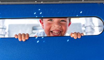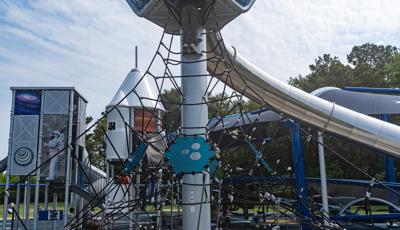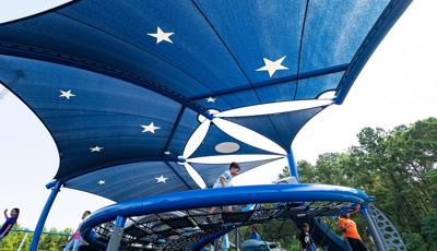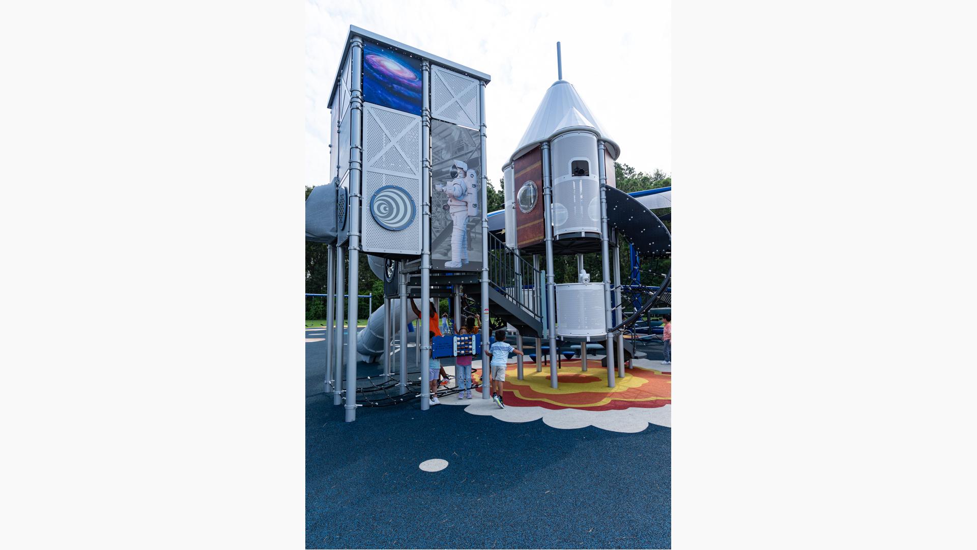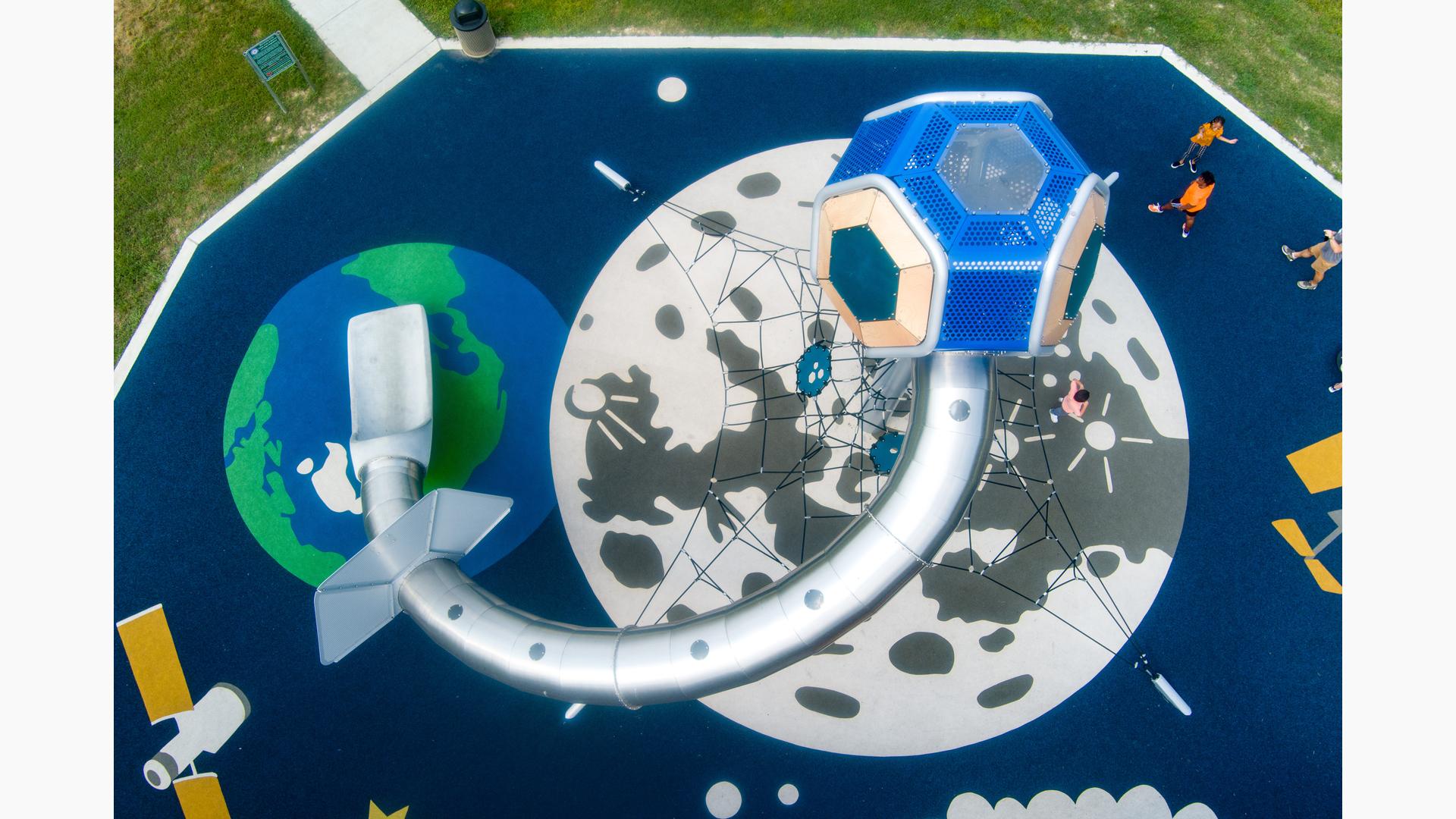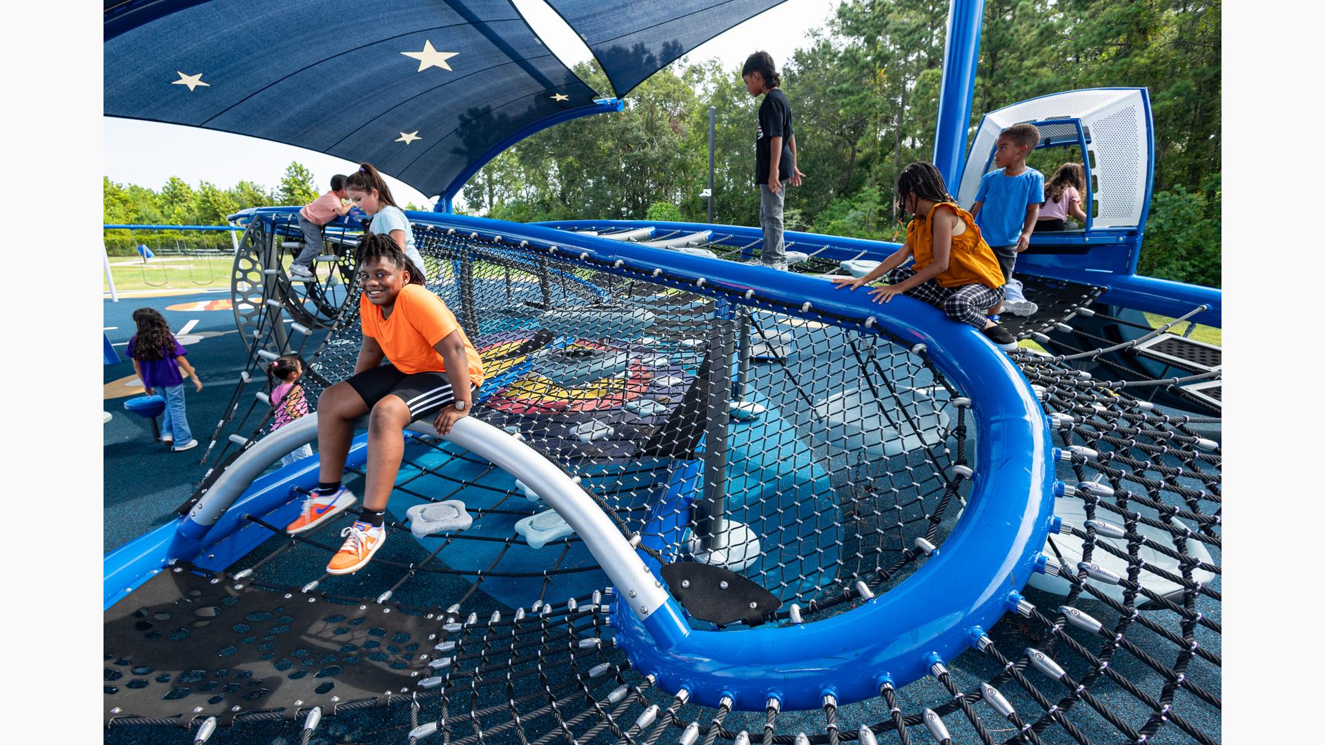 Design files are not available for this custom design. Contact your local playground consultant for additional details.The lucky kids at Jack M. Fields Elementary in Humble, Texas can shoot for the stars as they play on this out-of-this-world custom playground. A custom PlayBooster® mainstructure designed like a rocket ship and Hedra® tower with climbing net and stainless steel twisty slide are invitations to climb high and enjoy numerous options for an exhilarating descent. A huge figure-eight Quantis® netplay structure beckons with springy inclusive rubberized netting, inviting children to climb, crawl, bounce or hang out on its twists and turns. A multiple-bay swing set invites numerous children to swing side-by-side, while a custom shade structure sprinkled with stars provides cooling shade on hot days.