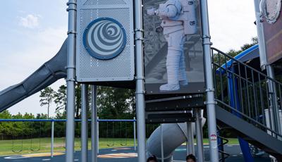 [video: scene fades into a full view of a space themed playground. Two girls stand next to each other as they talk about the playground.]