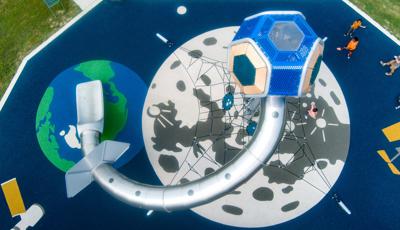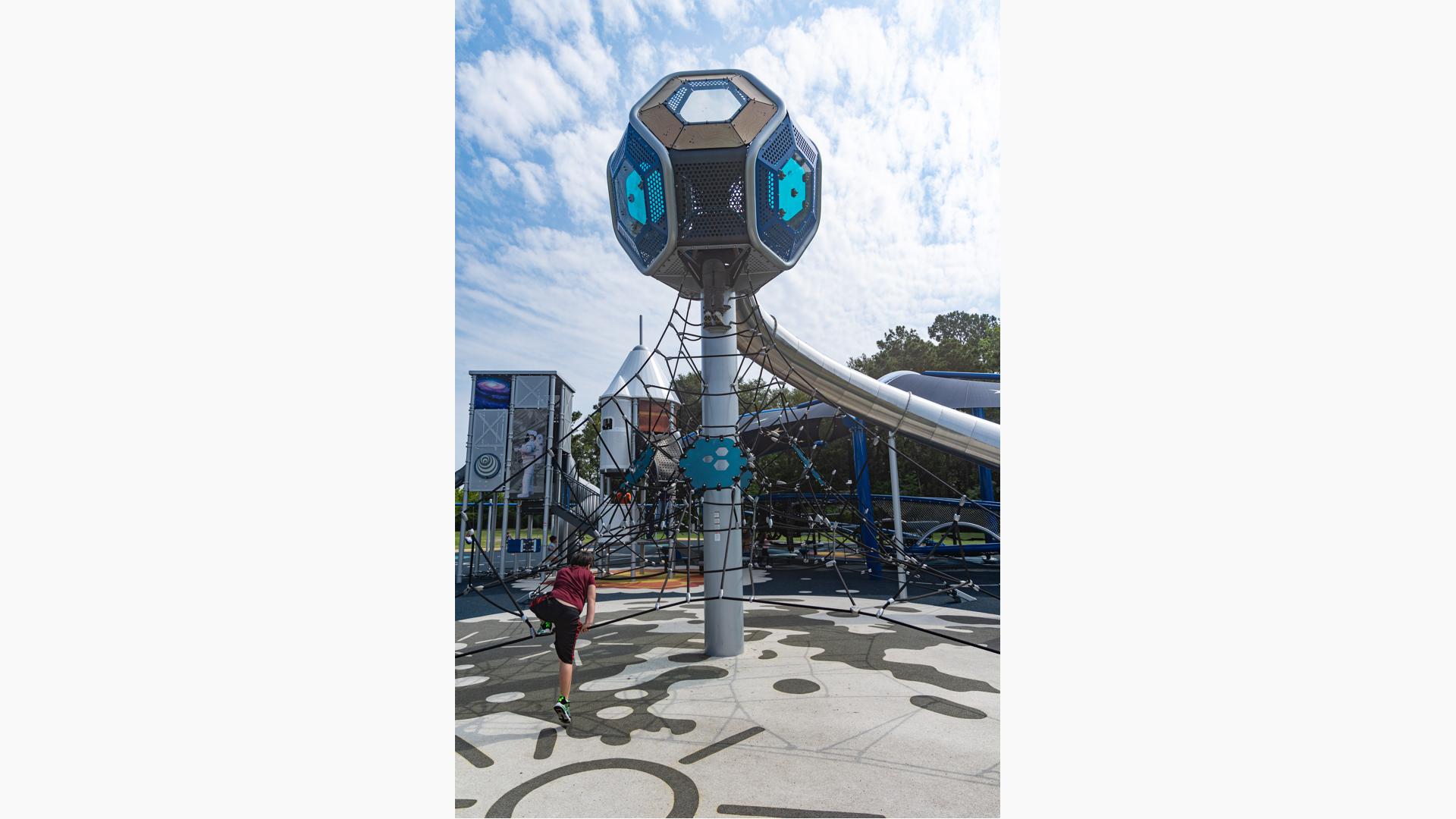[video: camera pans up ropes creating a pyramid shape leading up to a geometric shaped tower pod. Camera switches to an elevated view of the tower pod while a girl inside waves through a window. Camera pans the lower level of one of the playground structures as children play on different playground activities. Scene switches to a full elevated view of the play area showing the playground surfacing designed with planets, constellations, satellites, and the moon. Scene jumps to a girl as she talks about the playground.]