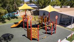 [video: scene fades into a full view of a play area set in between two buildings. Children play on the playground structure with two large yellow shade roofs. Scene switches to a girl standing on the ground spinning the pieces of a tic tac toe panel as another girl stands on the playground decking also playing with the panel. Camera switches to a side view as the two girls’ continue to play at the tic tac toe panel. Camera switches to a panning view up a swiggle shaped climber. A boy climbs the climber as a woman off camera asks him a question.]