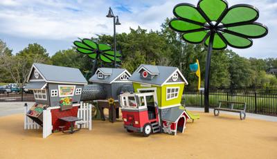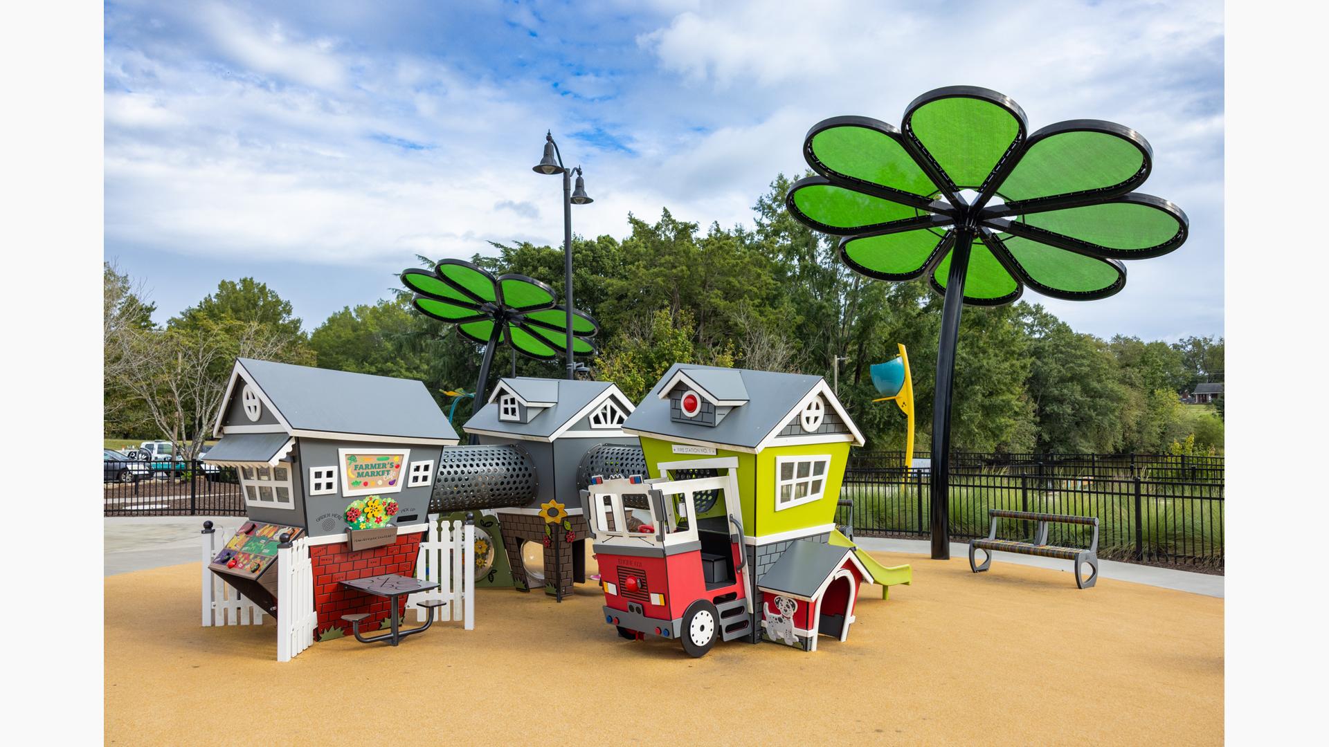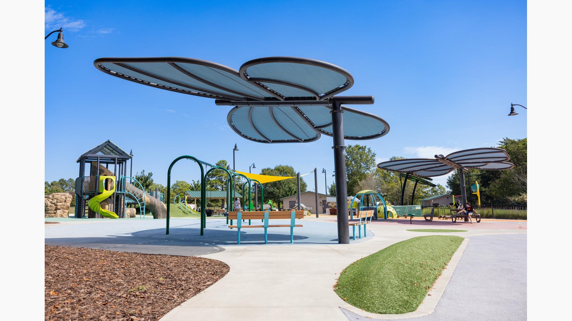 Contact Your ConsultantThe colorful, flower-themed playscape at Kidventure in Anderson, South Carolina, is a feat of nature-inspired creativity, where play blooms like flowers and buzzes like bees. Colorful flower- and butterfly-shaped shade structures tower over the play environment, which is laid out to look like a flower, butterfly wing and friendly bee, thanks to the colorful safety surfacing and landscape design.