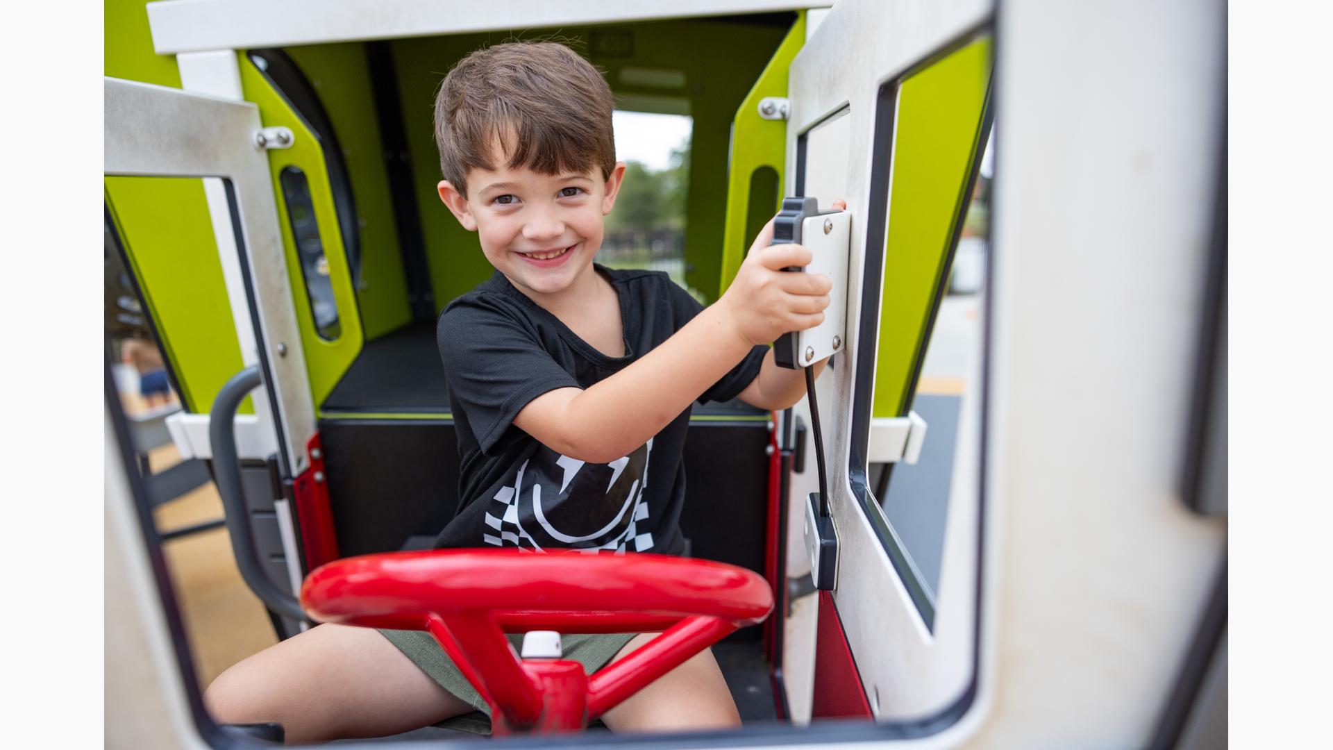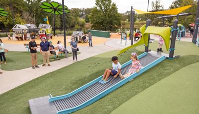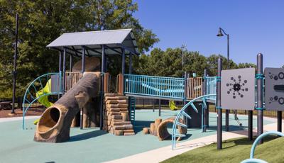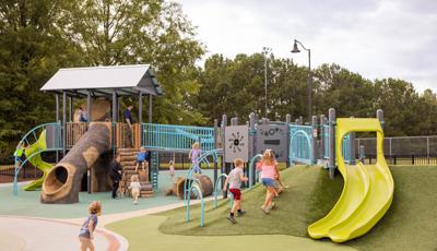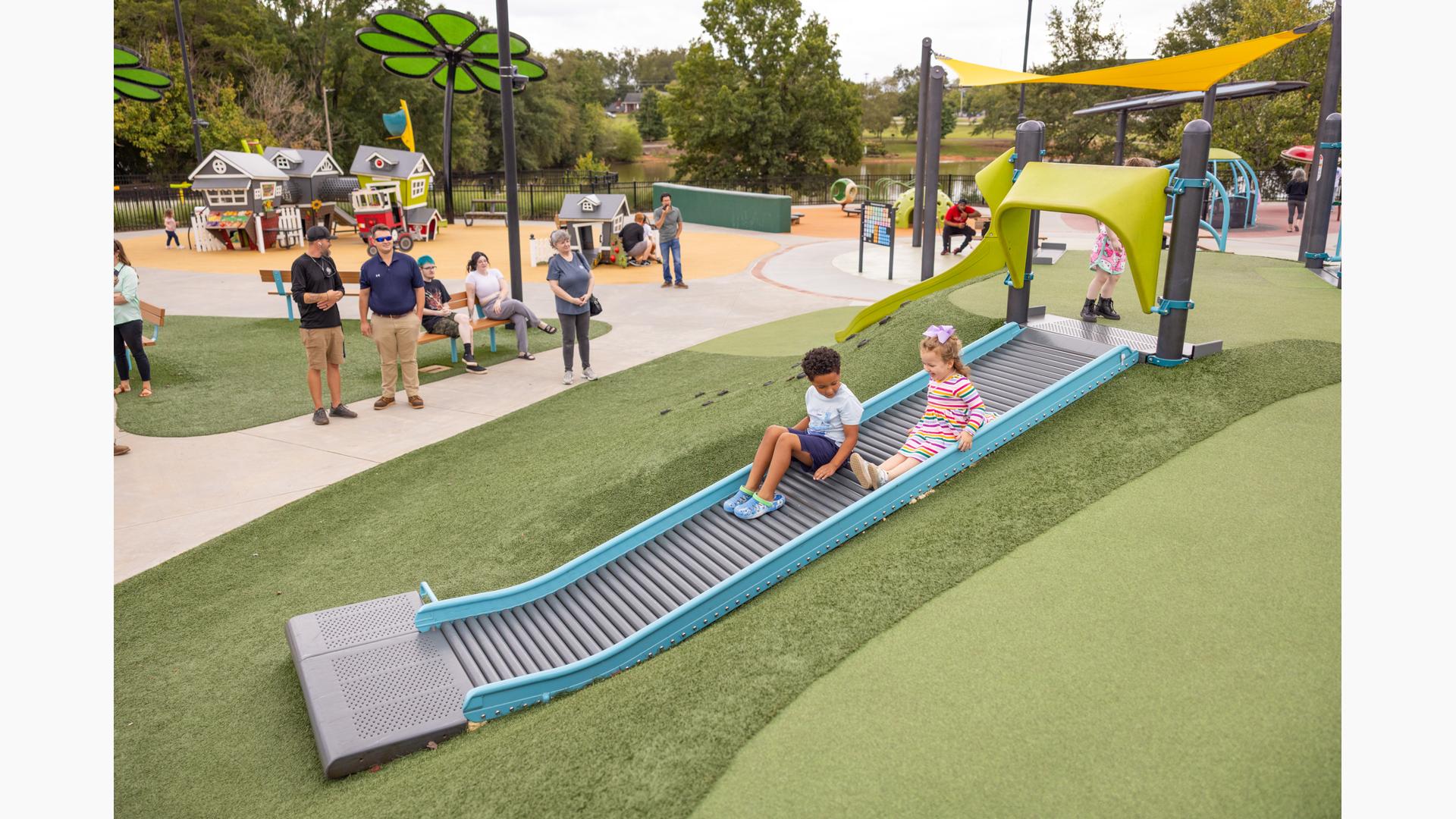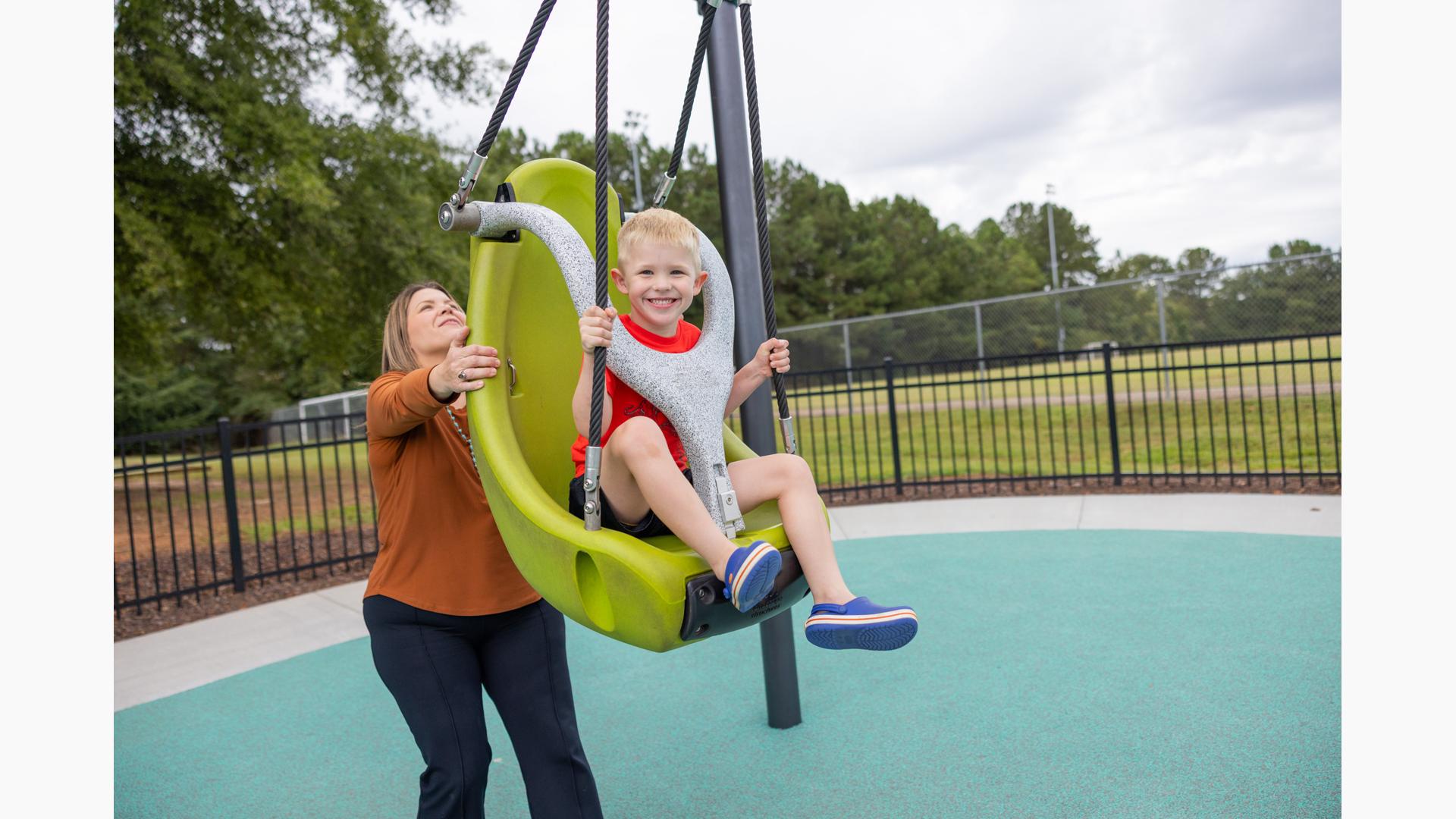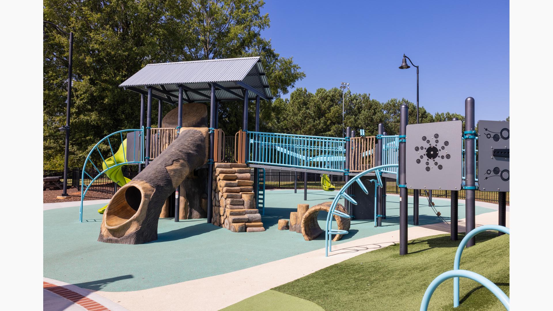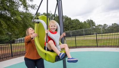 Another petal is a nature-inspired and thoroughly ramped PlayBooster® mainstructure with lifelike concrete logs and rocks shaped to enhance the outdoorsy feel. There's a section that contains a turf hill with a double slide and a Rollerslide on its slope, and another for the zooming motion of the ZipKrooz® zipline. Finally, the butterfly wing is home to a multi-bay swing set that has seat options for children of all abilities.