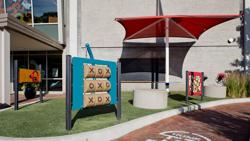 Contact Your ConsultantThe Kokomo-Howard County Public Library knows that sometimes kids need a break from reading, so they incorporated a small play space near the entrance. In addition to Tic-Tac-Toe, Driver and Image Panels, the Rhapsody® Cascata® Bells were included to encourage music making. Also, there's a CoolToppers® Single Post Pyramid to help protect visitors from the harsh effects of the sun and heat.