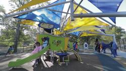 [video: fade to black. Fade in to an elevated view of the fence in play area and overhead SkyWays shades. Fade to black. Landscape Structures logo appears with text underneath reading: For a better tomorrow we play today.]